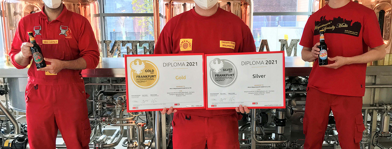 Die Weyermann® Braumanufaktur gewinnt erneut bei dem Wettbewerb Frankfurt International Beer Trophy, dieses Mal mit zwei Bieren. Ausgezeichnet wurde der Weyermann® Nr. 34 Rauchbier Bock mit Gold. Silber erhält das Weyermann® Nr. 37 Rheinaufwärts Alt. Beide Biere werden handwerklich in der Weyermann® Braumanufaktur von Braumeister Constantin Förtner und seinem internationalen Team gebraut.