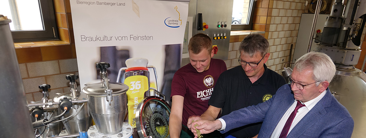 Die Vorbereitungen für das Jubiläumskreisla laufen auf Hochtouren. Beim offiziellen Brautermin Anfang August gab Landrat Johann Kalb gemeinsam mit den Braumeistern Alexander Eichhorn von der Brauerei Eichhorn (Dörfleins) und Christian Schuhmann von der Brauerei Zur Sonne (Bischberg) die letzten Zutaten in den Kessel: der Grundstein für das „Keller Pils“ ist gelegt.