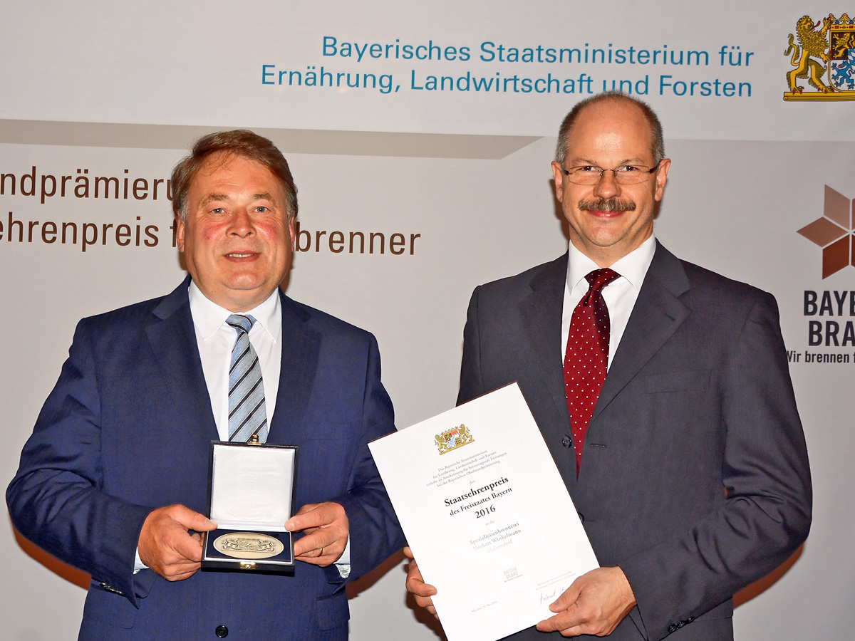 Zum zweiten Mal vergab das Bayerische Staatsministerium für Ernährung, Landwirtschaft und Forsten den Staatsehrenpreise für die bayerischen Brenner. Und wie schon beim ersten Mal 2014 stand Norbert Winkelmann aus Hallerndorf auch zwei Jahre später wieder ganz oben auf dem Treppchen. Die Prüfer vergaben für seine fünf eingereichten Edelbrände weit mehr als die für Gold notwendige Punktzahl.