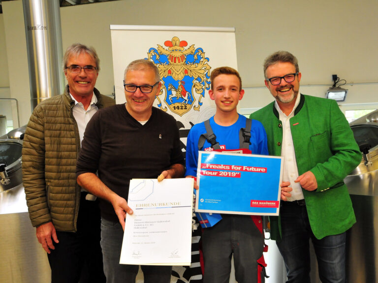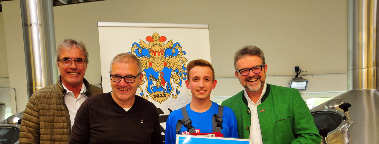Bei einem Besuch des Präsidenten der Handwerkskammer für Oberfranken Thomas Zimmer und HWK-Geschäftsführer Dr. Bernd Sauer gab es neben einem Geschenk für den Landessieger und die Aussicht auf eine Förderung der Meisterausbildung über die Stiftung für Begabtenförderung im Handwerk auch eine Ehrenurkunde für Brauereichef Georg Rittmayer für die besondere Ausbildungsleistung seines Betriebes. 18 Azubis haben er und die Generationen vor ihm in den zurückliegenden 60 Jahren zu Brauern und Mälzern gemacht.