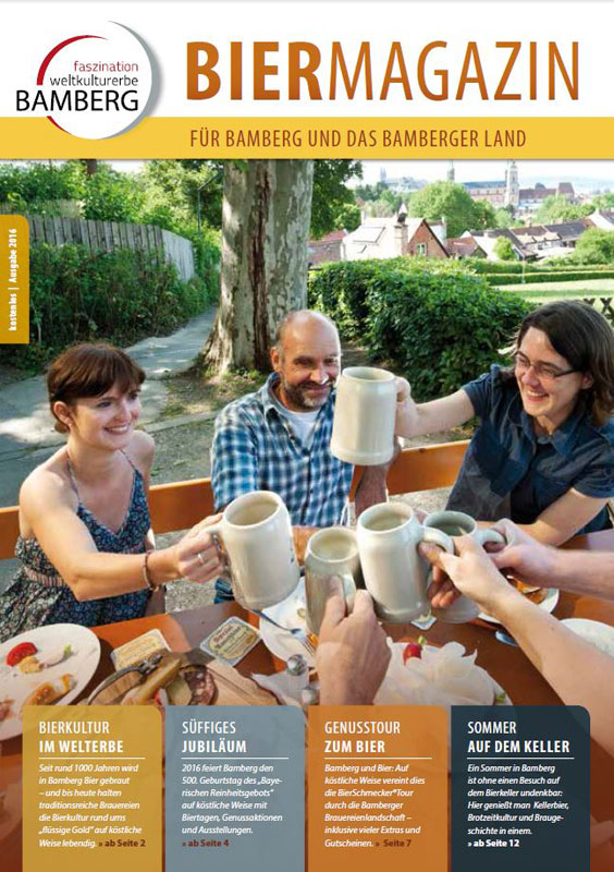 Das soeben erstmals erschienene „Bamberger Biermagazin“ stellt die Bierkultur der UNESCO-Welterbestadt und des Bamberger Landes vor. In dem vom Tourismus & Kongress Service herausgebrachten Magazin werden auf 16 Seiten bierige Themen präsentiert und süffige Geschichten erzählt. Das Heft ist kostenlos in der Tourist Information, Geyerswörthstr. 5, erhältlich.