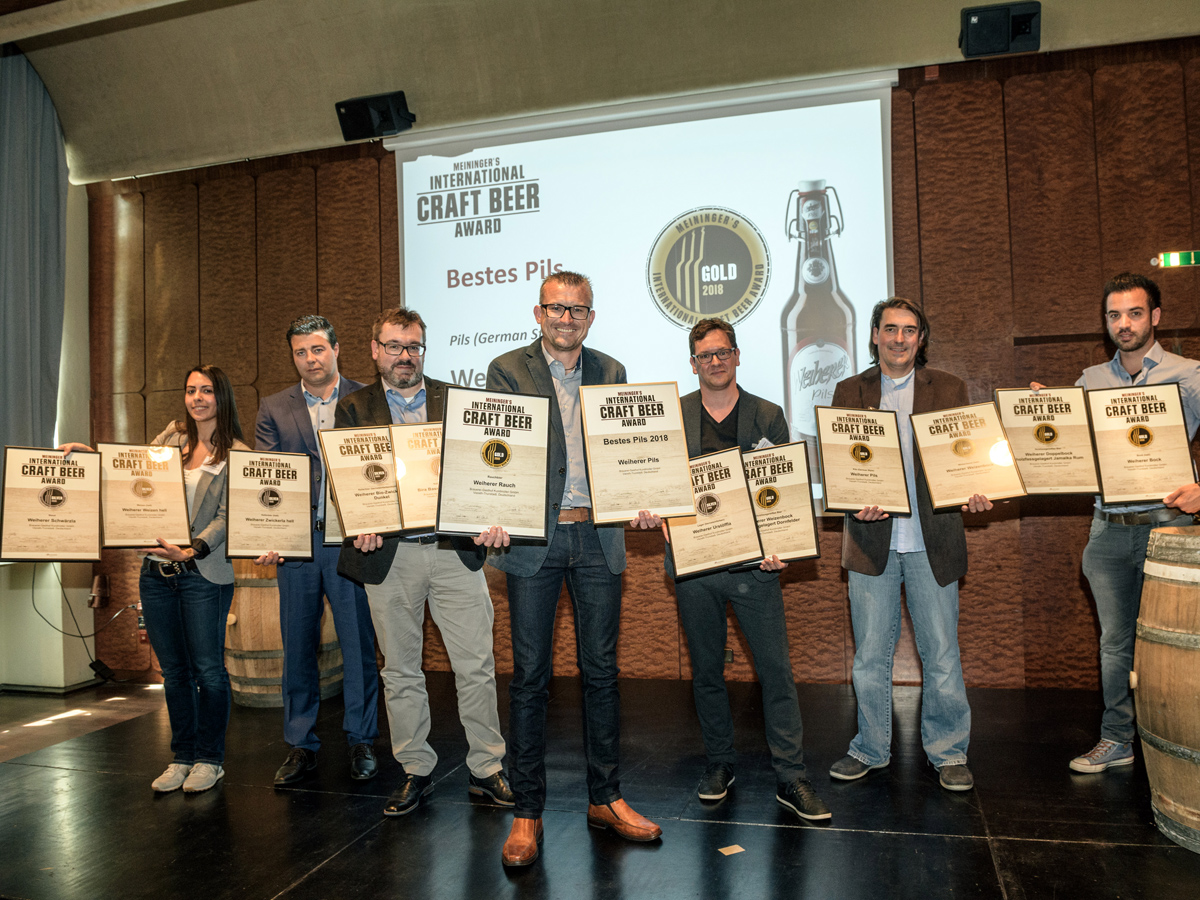 Der Meininger‘s International Craft Beer Award fand in diesem Jahr zum 5. Mal mit einem Teilnahmerekord von 1.090 Bieren statt. Im April hatte eine 84-köpfige internationale Expertenjury die eingereichten Biere in einer Blindverkostung unter die Lupe genommen. Die Besten wurden nun mit einer Medaille ausgezeichnet, zum ersten Mal wurden auch die Sieger der jeweiligen Kategorien bekannt gegeben und prämiert. Für die Brauerei Kundmüller hieß das nicht nur Nr. 1 in der Kategorie Pils (Gold und „Bestes Pils 2018“), was Braumeister Roland Kundmüller natürlich besonders freute, sondern auch noch Gold für Weiherer Rauch, Weiherer Bock, Weiherer Weizenbock, Weiherer Weizenbock holzfassgelagert Dornfelder, Weiherer Doppelbock holzfassgelagert Rum sowie Silber für Weiherer Zwickerla Hell, Weiherer Weizen Hell, Weiherer Bio Zwickerla Dunkel, Weiherer Urstöffla, Weiherer Schwärzla und die Kooperationen Weiherer / Cervejaria Bamberg Rauchbock und Weiherer / Bira Bassanese. Mit 14 Auszeichnungen ist die Brauerei Kundmüller damit der meistprämierte Teilnehmer des Wettbewerbs.