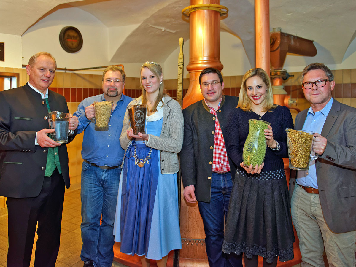 Auch die Macher des Fränkischen Bierfestes waren sofort vom Namen ihres Festbieres begeistert und gaben ihm noch einen Untertitel „Der wahre Urstoff“. Der wird an einem separaten Stand in eigens dafür gestalteten Seidla ausgeschenkt werden. Landherr und Pickel möchten ihren Gästen in diesem Jahr ein besonders schönes Fest bieten und haben neben dem MinneSeidla noch viele andere neue Ideen. Beispielsweise soll es einen Festumzug geben, der vom Nürnberger Hauptmarkt bis zum Festgelände führt: „Das könnte die längste Polonaise werden, die Franken jemals gesehen hat“, feixt Thomas Landherr. Angeführt werden wird der Zug auf dem Ellinger Brauereiwagen von der Bayerischen Bierkönigin Marlene Speck, die als Hobbybrauerin auch beim „MinneSeidla“ beteiligt ist. Gemeinsam mit Stefan Mützel wird sie in den nächsten Wochen den großen Sud dieses fränkischen Ur-Bieres einbrauen und ist selbst auch schon gespannt: „Ich hab ja schon viele Bier-Rezepte ausprobiert – zum Leidwesen meiner Mutter, weil ich immer ihre Küche benutze – aber so ein historisches Bier ist Neuland für mich. Da freu ich mich drauf!“ Sprach’s und verschwand mit dem Braumeister zu den Malzsäcken, um die Malzmischung zusammenzustellen.