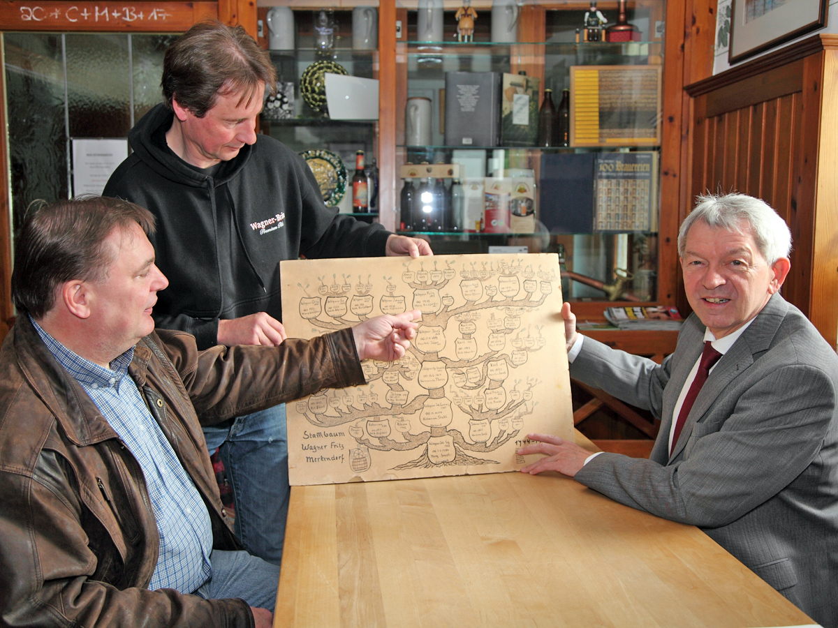 Die Familien Wagner verbindet eine lange Geschichte, was der Stammbaum eindrucksvoll beweist, den Braumeister Günter Wagner aus Merkendorf zum Gespräch mitgebracht hatte. Bei allen drei Brauereien handelt es sich um Familienbetriebe, die auf eine Brautradition zurückblicken können, die sich bis in das Jahr 1744 zurückverfolgen lässt. „Genau diese gelebte und einzigartige Geschichte der Brautradition über Jahrhunderte weg, gilt es zu erhalten. Bier ist Tradition, Kultur und Wirtschaftsförderung“, so Landrat Kalb. Daher ist ihm es ein besonderes Anliegen die jahrhundertealte Biertradition im Bamberger Land zu bewahren, die Brauereien- und Biervielfalt nachhaltig zu vermarkten und letztlich die Arbeitsplätze in dieser Handwerksbranche zu erhalten.