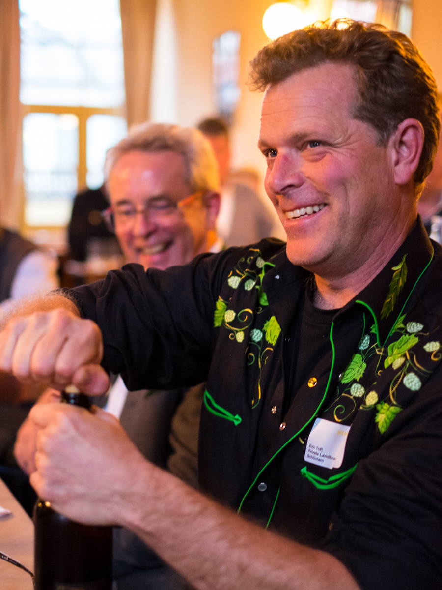 Am folgenden Tag stellten drei Brauanlagenhersteller ihre Neuentwicklungen zur Kalthopfung des Bieres vor. Mit der Gabe von Hopfen beim Gären oder Lagern lassen sich insbesondere die ätherischen Öle aus der Bierwürzpflanze wesentlich besser und effektiver ins Bier übertragen. Eine Verkostung verschiedener Chargen aus der Romeis-Versuchsbrauerei konnte das eindrucksvoll verdeutlichen. Stefan Stang, Mitglied der Geschäftsleitung des Bad Kissinger Institutes verschaffte zudem den Brauern einen Überblick zur aktuellen Rohstoffsituation. Spannendes Fazit: Weder bei der Gerste, noch beim Hopfen kann sich die Branche in den nächsten Jahren Ernteausfälle leisten. Trotz Flächenausweitung wird der Bedarf der wachsenden Bierszene gerade einmal gedeckt werden können, ohne viel Luft nach oben – eine wichtige Motivation für die Brauereien, rechtzeitig Lieferverträge abzuschließen und die Rohstoff-Versorgung auf mehrere Lieferanten zu verteilen. Nach weiteren intensiven Vorträgen rund um Hygiene und Qualitätssicherung in der Brauerei klang auch der zweite Tag bei weiteren Verkostungen und regem Erfahrungsaustausch aus. Sowohl Bierquerdenker-Workshop, als auch Brauertag sind echte Erfolgsmodelle und für viele „Stammgäste“ aus der Bierwirtschaft gar nicht mehr wegzudenken, so waren sich am Ende alle einig.