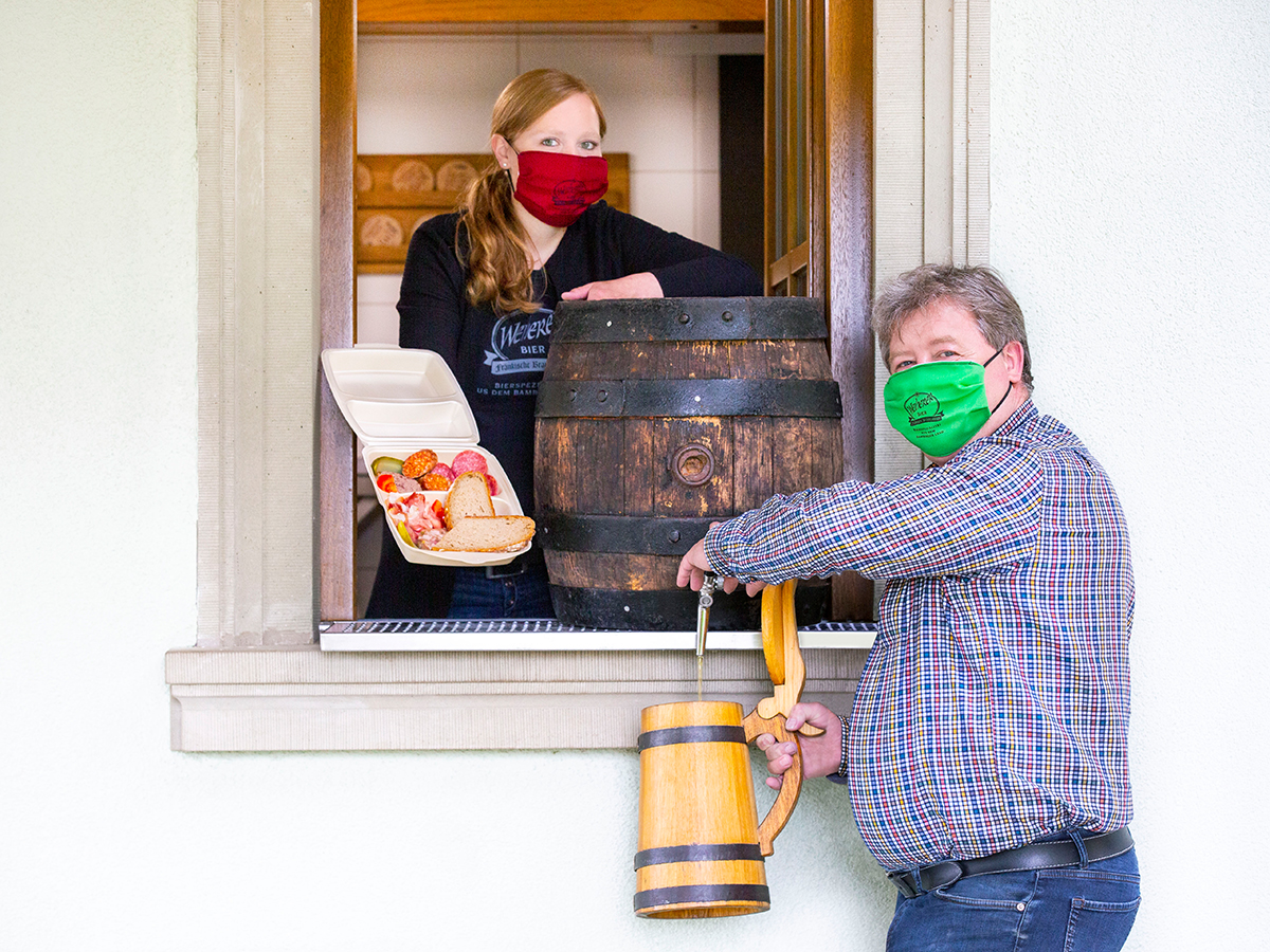 Das Bier darf am Fass selbst gezapft werden. Desinfektionsmittel steht bereit und muss benutzt werden. Die gängigen Vorschriften gelten auch beim Weiherer Abholservice: Mindestabstand von 1,5 Metern einhalten.