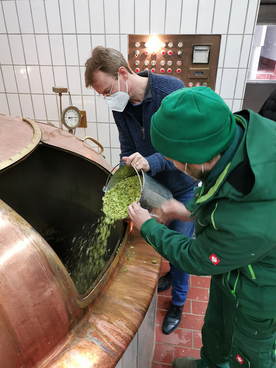Matthias Trum (links) und Kris Emmerling vom Bamberger Hopfengarten geben Hopfen in den Sudkessel.