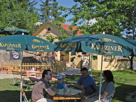 Das Konzept von Melanie Bauer ist einfach und hat es doch in sich: Hier ist die ganze Familie am Werk und will insbesondere anderen Familien eine schöne Zeit bereiten. Klingt banal, ist es aber nicht, in jeder Hinsicht. Und so erwartet Sie ein verwinkeltes, überall begrüntes Kleinod, das so auch in der Toscana stehen könnte. Liebevoll kommt auch die Küche daher, unser Favorit war der Bratwurstsalat, aber auch Kochkäse und Gerupfter wussten zu überzeugen. Wer es warm haben will, kann auf Pinsa und Burger zurückgreifen.