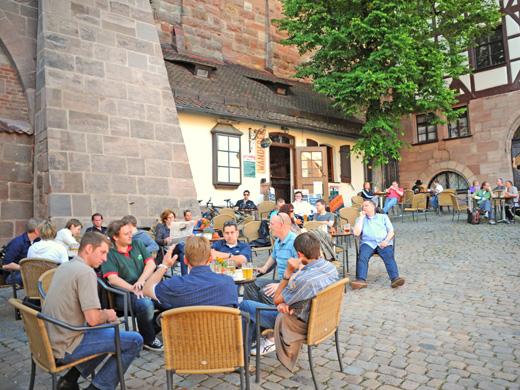 Pilgern die Touristen zur Burg, machen die Bierfans meistens vor dem Eingang Station. Denn hier lockt das Bieramt mit einem ungemein süffigen Angebot an fränkischen Gerstensäften. Dazu gibt es urige Wurstklassiker und doppelt gebackenes Bauernbrot. Dieses Angebot sorgt dafür, dass der kleine Eingang meist von Männern mit dem Krug in der Hand umlagert ist, ein echtes Bier-Happening, das richtig Laune macht!