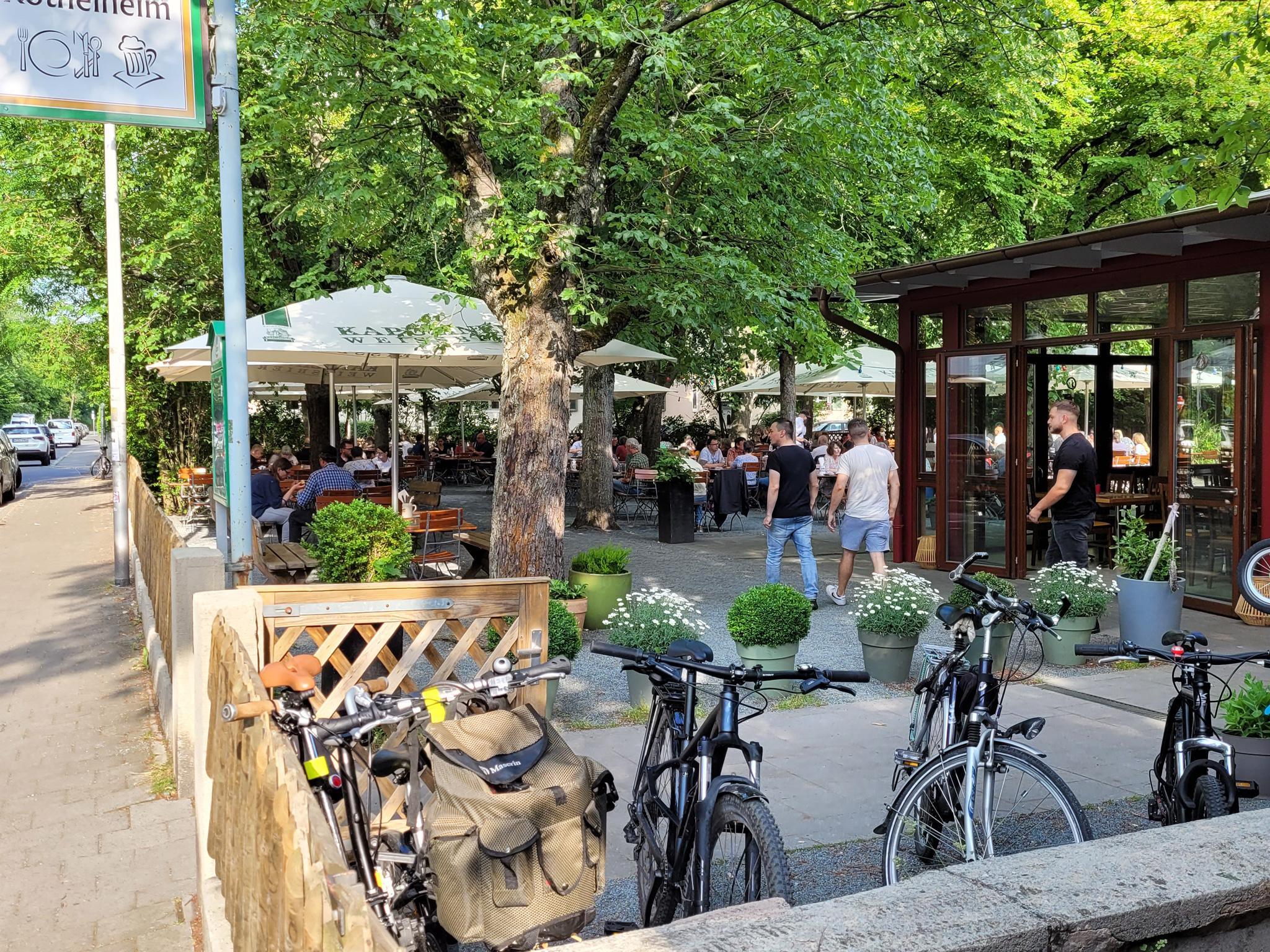 Für die Siemensianer stellt der Biergarten am Röthelheim heute eine willkommene Alternative zur Werkskantine dar (Der Renner: Currywurst oder blaue Zipfel). Am Anfang stand die Versorgung der Arbeiter aus dem Viertel sogar im Mittelpunkt, als man den Laden 1929 einrichtete. Auch die Schüler des benachbarten Ohm-Gymnasiums zogen und ziehen die Bierbänke dem Schulmobiliar in Freistunden vor, auf ein Kartenspiel und ein Getränk … Mittlerweile ist er der sommerliche After-Work- bzw. Warm-Up-Biergarten mit dem Spitznamen „Bretterhotel“ für die abendliche Unternehmung, insbesondere für Gäste aus der direkten Umgebung oder Radler aus der ganzen Stadt. Spannend ist es allemal, denn hier trifft sich nach wie vor ein Spiegelbild der Erlanger Stadtgesellschaft, also Studenten, Arbeiter, Siemensianer, Senioren und Familien – eine perfekte Gelegenheit für neue Bekanntschaften und natürlich auch ein gutes Bierchen.