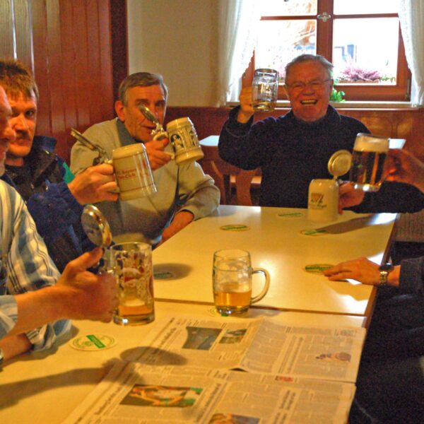 Hinter dem Zapfhahn am frisch angestochenen Fass steht Erich Witzgall und füllt die Krüge der Durstigen bis zum Rand. Die bringen ihre Deckel zum Striche-Machen selber mit.