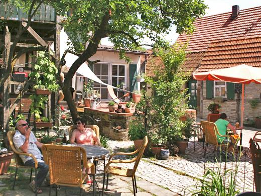 In den individuellen Innenhof-Biergarten vom „Büffel“ – so der Spitzname von Roland Hellmuth – verirren sich nicht nur Liebespärchen, sondern auch vor allem viele Motorradfahrer, die deswegen Oberlauringen als festen Zwischenstopp in ihre Route einplanen. Schließlich ist auch Büffel selber gerne auf seiner Harley unterwegs und macht dabei automatisch Werbung für den Biergarten. Passend dazu stehen die entsprechenden Klassiker wie Hamburger, Schaschlik, Currywurst und Schnitzel auf der Speisekarte. Am Wochenende und auf Bestellung werden Makrelen vom Grill angeboten. Bei schlechtem Wetter und im Winter steht die Scheuer mit bollerndem Kaminofen zur Verfügung, dadurch ist der Biergarten ganzjährig geöffnet.