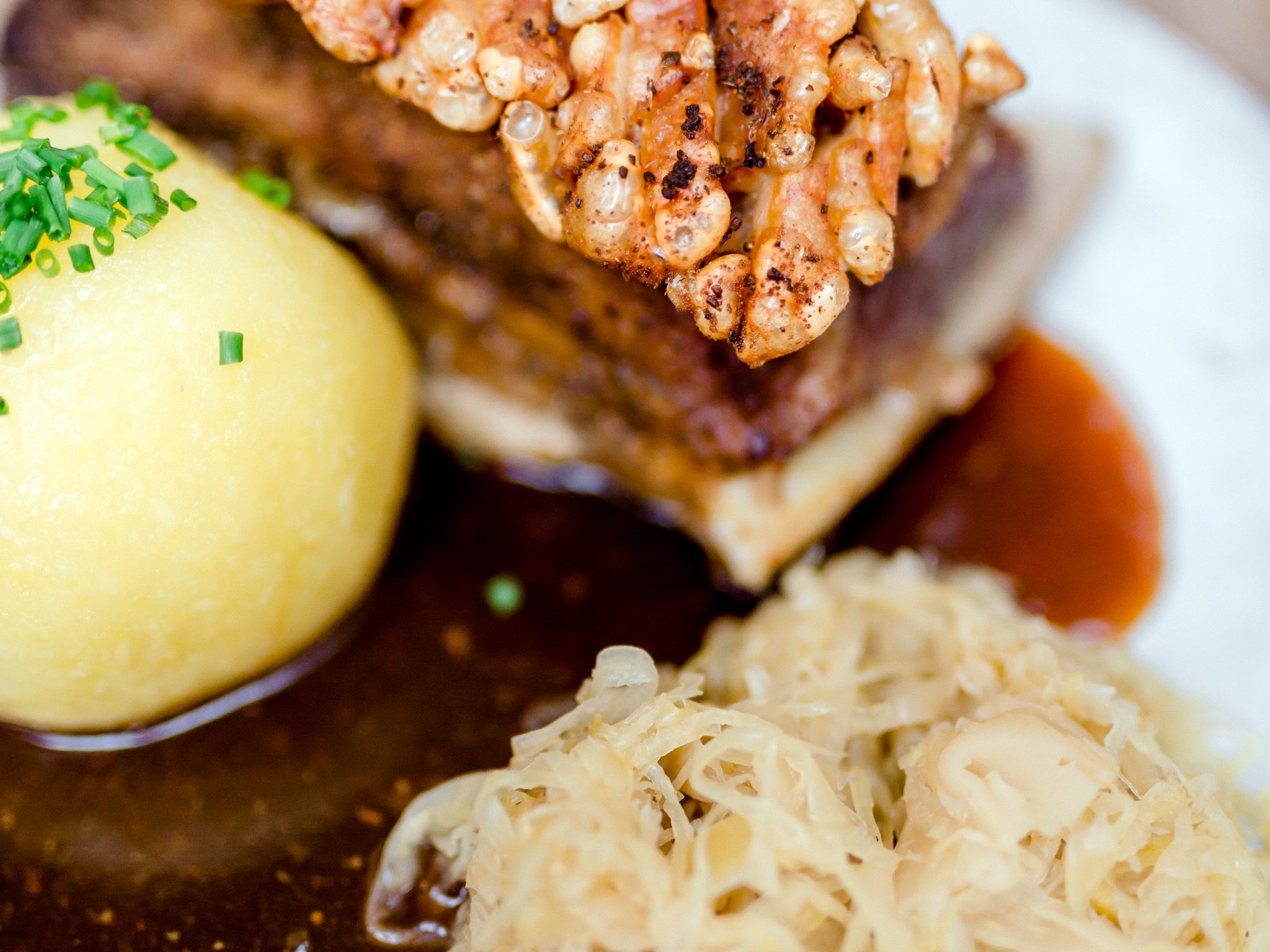 Fränkische Brotzeiten. Täglich mittelgroße Karte mit warmen Gerichten. Spezialitäten: Ente mit Kloß und Blaukraut, Bergknödel (Kaspressknödel mit Spinat), Pilzknödel (saisonal), Schäuferla, viele vegetarische Speisen, vegane Gerichte.