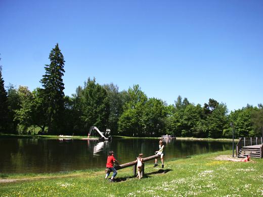 Das ist das Programm auf der Freizeitanlage Steinberg, zu der auch ein maximal 1,90 Meter tiefer Badesee gehört – und ein großer Grill, den man mit eigenem Grillgut (und Getränken vom Kiosk) benutzen kann. Für Kinder gibt es einen gut ausgestatteten Spielplatz und den nahe gelegenen Zauberwald, in dem schon über 70 Holzskulpturen des Zimmermanns und Künstlers Heinz Spindler stehen. Verständlich, dass man bei diesem Ambiente auch gemütlich ein Bierchen trinken kann, die Speisepalette hält sich in Grenzen, aber erfüllt bestens ihren Zweck.