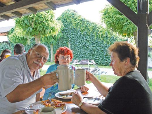 Einer der am liebevollsten angelegten Biergärten, die wir gesehen haben. Überall hängen kleine Windspiele herum, sichtbar mit Plan wachsen hier und da die unterschiedlichsten Pflanzen aus Ritzen und Kübeln, im hinteren Teil ein Holzbrunnen. Dazu ein wirklich schöner Spielplatz und ein Kuhstall, der immer für Unterhaltung sorgt. Zur Kirchweih drängen sich die Stammgäste bei gegrilltem Fisch und hausgemachten Bratwürsten im Biergarten und lassen das Bamberger Mahrs Pils durch die Kehlen rinnen.