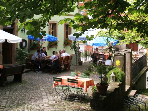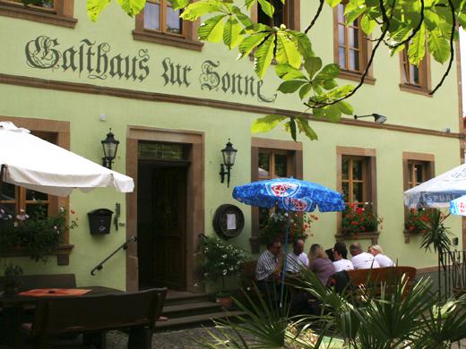 Das Gasthaus zur Sonne liegt etwas zurückversetzt und bietet daher ein bisschen mehr Erholung als man vom gastronomischen Zentrum des Weinortes erwarten würde. Über 100 Jahre schon schenkt hier die Familie Kraus Biere der Brauerei Düll aus Krautheim aus und bietet Gutes aus eigener Hausschlachtung. Dafür gab es sogar schon eine Bronzemedaille beim Wettbewerb Bayerische Küche für Andreas Kraus, der schon seit relativ jungem Alter bereits für die Küche verantwortlich zeichnet.