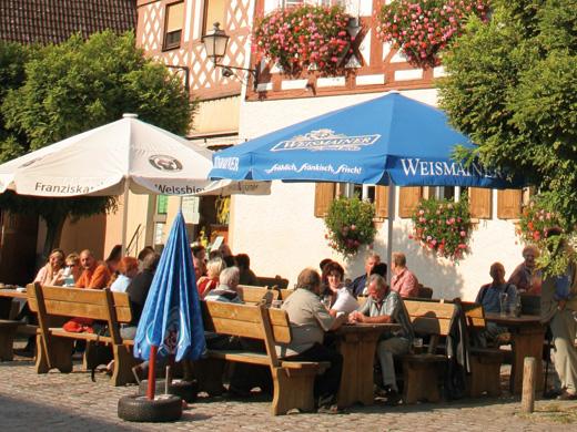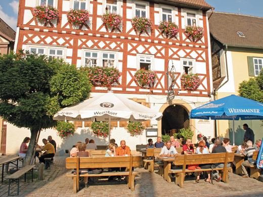 Im schönen altfränkischen Seßlach gibt es eine besondere Biertradition: Im Kommunbrauhaus entsteht das Bier für die Gasthäuser und Hausbrauer, die jeden Fasstag ihre Ration abholen können. Für den Großabnehmer Reinwand wurde eine Pipeline verlegt, durch die der Saft den Weg in die durstigen Kehlen findet. Seit der Gründung 1640 befindet sich das Gasthaus im Familienbesitz. Vor dem Haus auf dem malerischen Maximiliansplatz bilden Biergarnituren einen kleinen gemütlichen Biergarten.