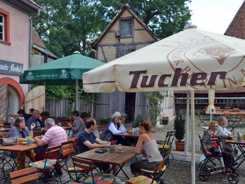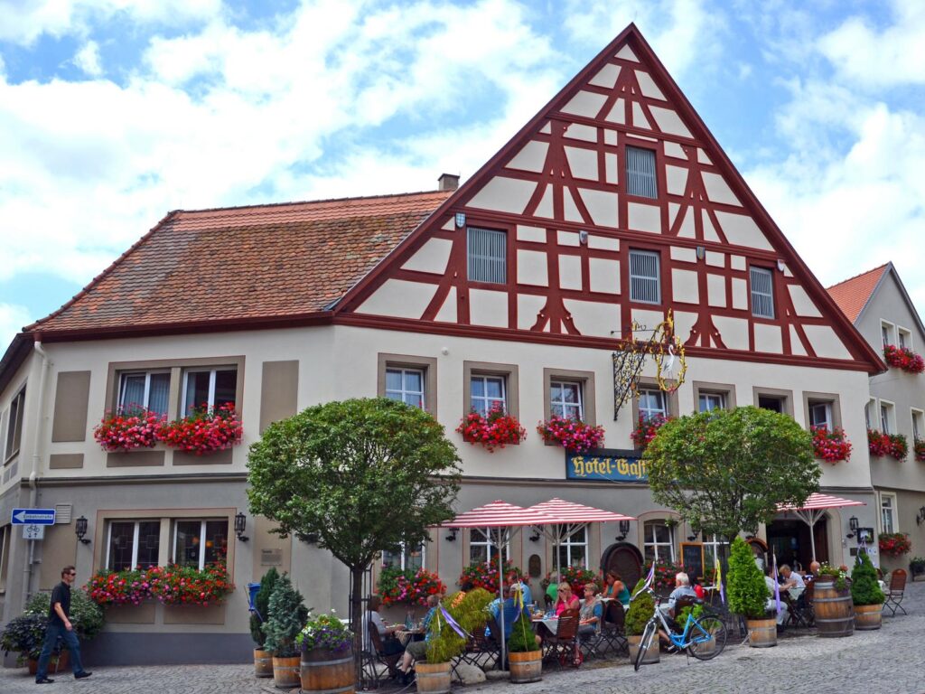 Mit mehr als 750 Jahren auf dem Buckel ist der „Storch“ das älteste Fachwerkhaus in Mittelfranken. Der Name rührt allerdings nicht vom eigenen Meister Adebar her. Früher stand nebenan eine Brauerei, auf deren Turm eine Storchenfamilie lebte. So wurde aus dem Gasthaus das Haus „beim Storch“. Mittlerweile kommen die beliebten Vögel auch wieder regelmäßig nach Bad Windsheim – und erledigen ihren Job. Die Inhaberfamilie zählt viele Köpfe, die alle gerne Hand anlegen. Im Biergarten am Weinmarkt sitzt es sich wunderschön zwischen Fachwerkhäusern und dem Brunnen. Ein kleiner Geheimtipp sind die Salate aus eigenem Anbau!