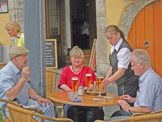 Nämlich hier beim freundlichen Kellner zu holen. Zumindest, wenn es um Rothenburg oder Ihre kulinarischen Bedürfnisse geht. Da sind Sie nämlich in der Ratsstube bestens aufgehoben, egal, ob Hunger oder Durst. Selten haben wir eine so zarte Schweinehaxe gegessen, ein echtes Gedicht. Neben dem Gärtchen ist vor allem ein Besuch der Kellergewölbe spannend – wieder einmal ein Ort, an dem die Rothenburger Geschichte noch lebendig ist.