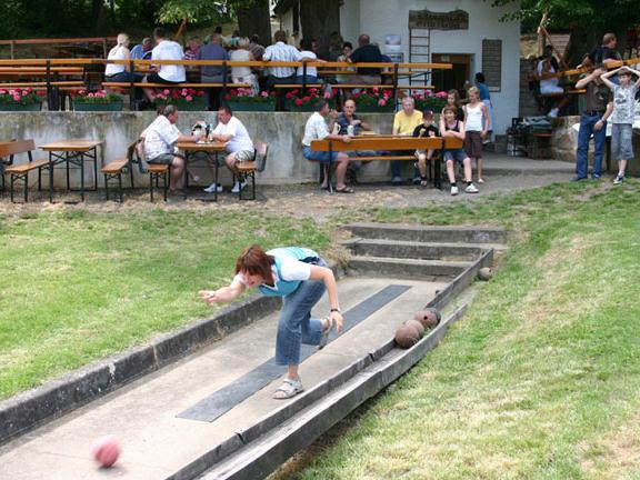 Das Biermekka Hallerndorf hat dem Freund des Gerstensaftes eine nahezu unglaubliche Vielfalt zu bieten. Über 50 verschiedene Biere, sieben Brauereien und viele Bierkeller. Einer der urigsten ist der Gartenkeller der Rittmayer-Brauerei. Nicht ganz so weit oben wie der Kreuzberg, aber dennoch erhaben über der Ortschaft können Sie hier ihr kühles Bierchen genießen. Die alten Bäume spenden angenehmen Schatten und die Naturkegelbahn lädt zum Zeitvertreib ein. Die Sportstätte liegt quasi auf dem Präsentierteller, so dass die gesamte Gästeschar anfeuern und mitfiebern kann – probieren Sie es aus!