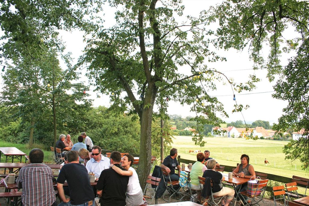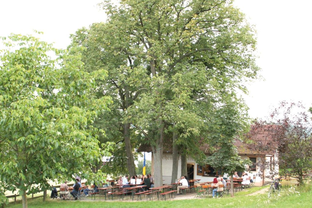 Hier kommen sowohl die Erwachsenen als auch die Kinder auf ihre Kosten: Zum einen sitzt es sich hier wunderbar auf dem ehemaligen Weinberg unter den uralten Kastanien, zum anderen können die Kleinen hier nach Herzenslust spielen und auf den umliegenden Wiesen springen und toben. Außerdem improvisiert man hier gerne – auf die Frage nach der eingeschnittenen Wurst zum Mitnehmen wurde kurzerhand ein Bierkrug als Behältnis umfunktioniert und mitverkauft. Die leckeren Fleisch- und Wurstwaren werden eigens von einer fränkischen Metzgerei für den Scheubel-Keller gemacht.