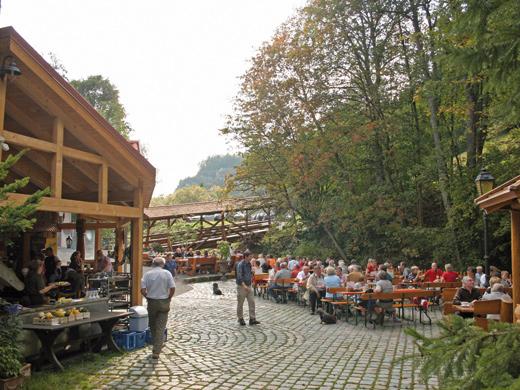Einer der Vorzeige-Biergärten der nördlichen Fränkischen Schweiz ist die Schrepfersmühle. Wunderschön in der Natur gelegen, mit eigenem Hof und Tieren. Besonders für Wanderer eine wunderschöne Umgebung. In der Schrepfersmühle gibt es unter anderem Edelbrände aus der Fränkischen Schweiz. Italienisches Ciabatta mit Walnüssen wird direkt vor Ort frisch gebacken, Essen mitbringen ist hier aber auch erlaubt. Die Schrepfersmühle als Gaststätte gibt es seit 2004. Frau Laborde hat die ehemalige Papiermühle mit Wasserkraftwerk gekauft und umgebaut. Der Biergarten befindet sich vor der Mühle direkt am Bachlauf.