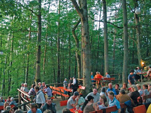 Hier kann man die fränkische Bierkellertradition perfekt nachvollziehen. Unten im Hügel die Felsenkeller, darüber Schatten spendende Baumriesen und zwischen den Stämmen Bierbänke für durstige Reckinnen und Recken, die sich auf Schäuferla, Bratwürste, Grillhähnchen und die Brotzeitkarte freuen. Das Menü des Tages steht dabei auf riesigen Tafeln von Hand geschrieben, die täglichen Extras hängen in kleineren, bunt umrahmten Tafeln darunter. Die erste Aufgabe besteht also im Lesen, doch dann folgt garantierter Genuss.
