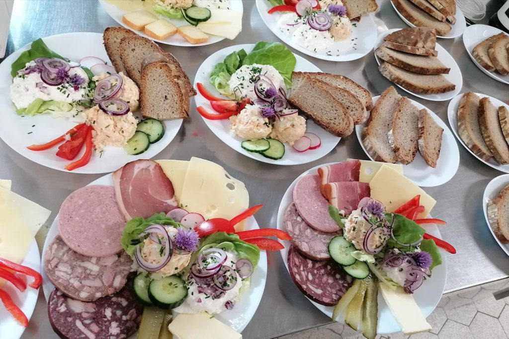 Fränkische Brotzeiten. Spezialitäten: Brotzeitteller, Presssack rot und weiß, Limburger mit Musik, Ziebalaskäs, rohe Schinkenplatte, Käseplatte, Göttinger, Wienerle mit Brot.