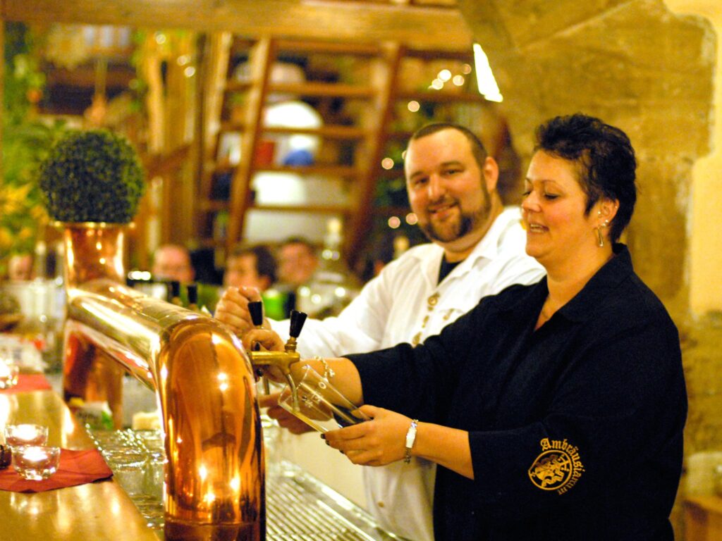 Seit 2004 hat Bamberg mit dem Ambräusianum eine weitere Attraktion: eine echte Gasthausbrauerei. Ambros Michael Mahr und seine Frau Heike Görmann haben sich mittlerweile fest im Herzen von Bamberg etabliert. Immer mehr Bamberger führen ihre Besucher stolz in das Brauerei-Kleinod, um einmal mehr zu beweisen, wie schön ihre Weltkulturerbestadt doch ist. Und damit haben sie – so finden wir – völlig recht! Bambergs ehedem jüngste Brauerei hat nichts an ihrer Anziehungskraft und Liebenswürdigkeit verloren, auch wenn ihre Gründung mittlerweile schon eine geraume Zeit her ist. Nicht nur der Laden selbst, auch die beiden Sprösslinge des Hauses sind den Kinderschuhen entwachsen, und so macht sich bald die nächste Generation auf, die Tradition im ehemaligen „Schnaps Mahr“ weiterzuführen. Unter diesem Namen kennen die ältesten Bamberger das Haus, das früher der Spirituosenversorgung vor allem der geistlichen Herren der Domstadt diente. Heute ist es vor allem der sehr kleine, aber auch wunderschöne Biergarten vor dem Brauereigebäude, der uns – und Sie – auf gemütliche Stunden bei feinen Bieren und Speisen einlädt.