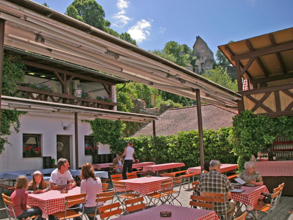 Im Hufeisen wird im Sommer regelmäßig am Mittwoch und Donnerstag gebraut. Riechen, schmecken und probieren Sie die Entstehung der Bierspezialitäten „Pottensteiner Bio-Dunkel“, „Kellerweizen“ und „Premium Pils“. Dann wird Ihnen der Braumeister auch direkt alle Fragen zum bekannten Pottensteiner Bierbrand oder zur Bierherstellung beantworten. Zünftige Bierproben mit Wissenswertem über die jeweiligen Biersorten mit dem Braumeister auf Anfrage! Bei der Gasthausbrauerei Hufeisen gibt es alles, was fränkische Brauereikultur ausmacht. Die Braustätte ist in fränkischen Fachwerkhäusern untergebracht – erbaut 1738. Der Biergarten befindet sich am Fuße der über 1.000-jährigen Burg Pottenstein, der alte Gärkeller in der Hollergasse 21 wurde mit viel Aufwand und Liebe zur „Kellerschänke“ umgebaut. Entstanden ist dort eine, wie eine Höhle in den Fels gehauene, naturbelassene Kellerwirtschaft, vermutlich einmalig in Franken. Biere und Brotzeiten gibt es auch im Biergarten, bei schönem Wetter kann man hier vor dem Keller die wunderbare Aussicht genießen!