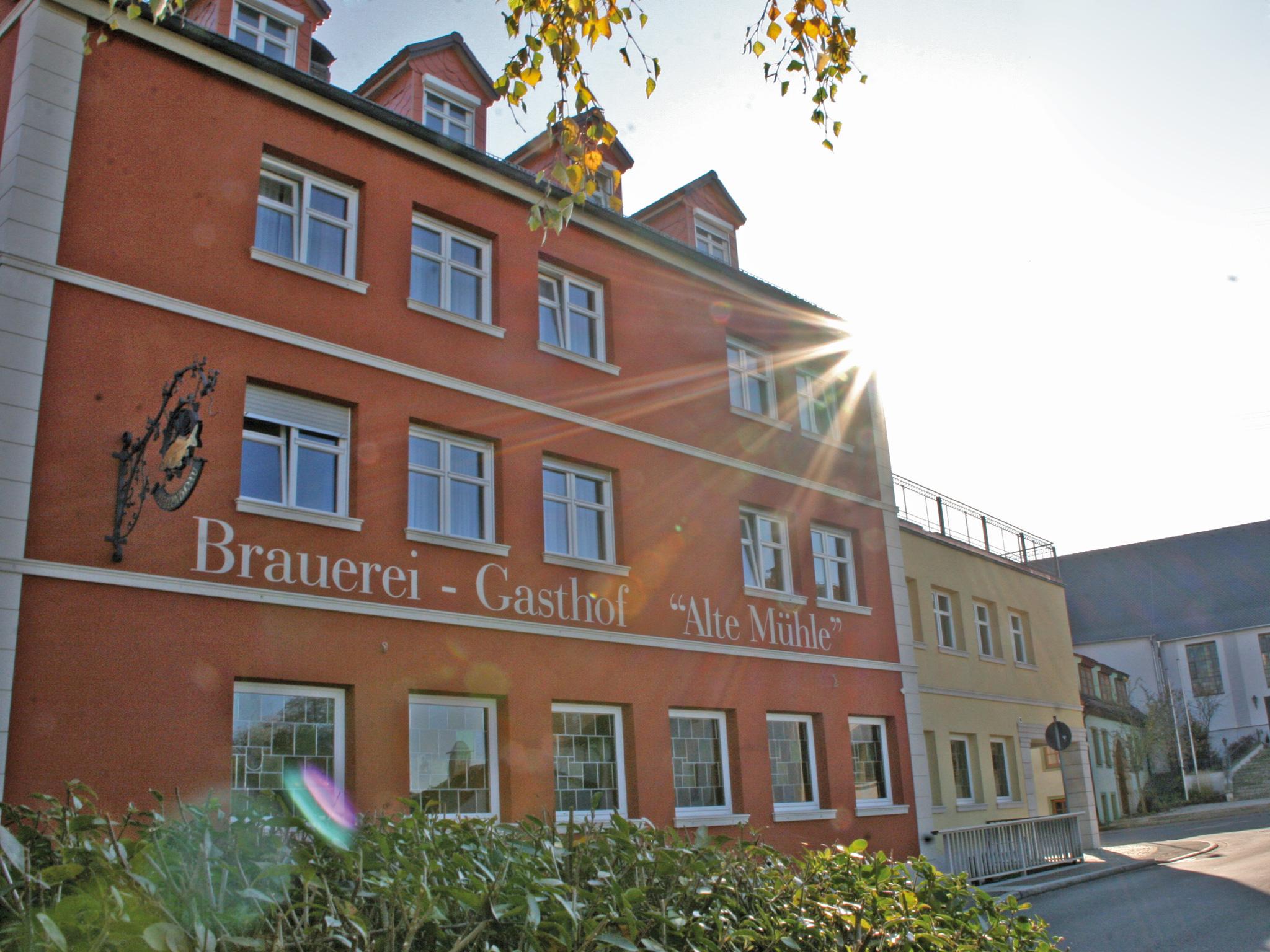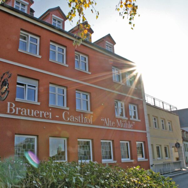 Die Mühlenbräu an dem Flüsschen Aurach war ursprünglich eine der ältesten Mühlen Oberfrankens (Entstehungsjahr 1348/49). Um 1793 erhielt die Mühle das Brau- und Schankrecht. Bis zur Modernisierung 1994 wurden Brauerei und Mühle noch von Wasserkraft angetrieben und mit Holz geschürt. In Sachen Bier kann man hier nichts verkehrt machen. Wir empfehlen auf jeden Fall den „Eremitentrunk“, ein echtes Klosterbier, das anlässlich der 700-Jahr-Feier Mühlendorfs kreiert wurde. Im Brauerei-Gasthof „Alte Mühle“ schenkt Familie Merklein ganzjährig Pils, Helles, Dunkles und Weizen aus. Dazu bieten sie deftige fränkische Hausmannskost mit hausgemachten Klößen. Außerdem finden sich auf den Tellern Forelle und Waller sowie in den Monaten mit „r“ die eigenen Karpfen. Zünftige Hausmacherbrotzeiten, Trockengesalzenes, hausgeräucherter Schinken und Zwetschgenbames aus eigener Aufzucht und Schlachtung runden das Angebot ab. Der eigene Bierkeller lädt vom 1. Mai bis Ende August Mi bis Mo ab 16 Uhr ein.