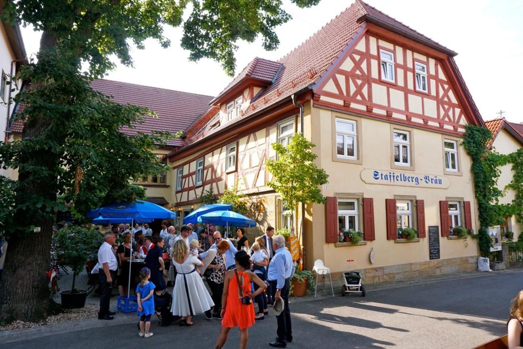 Das edle Wasser aus einer eigenen Bergquelle von Frankens heiligstem Hügel gibt natürlich als Rohstoff dem süffigen Bier einen ganz besonders heimischen Charakter. Quasi der heilige Veit persönlich steht Pate bei jedem Brauvorgang und insbesondere das „Loffelder Dunkel“ schmeckt so, wie man sich Franken als Bier vorstellen würde: urig, würzig, kernig, frisch, mit einem großen, liebenswürdigen Charakter. Das wunderschön renovierte Fachwerkhaus lädt einfach zum Verweilen ein: nicht nur das gute Bier, sondern auch die gute Küche, die viele Spezialitäten aus eigener Schlachtung bietet. Verantwortlich dafür sind Karl-Heinz Wehrfritz, einer der Chefs des Hauses, Metzger und Braumeister, und seine Frau Helga. Besonders sehenswert ist der historische Tanzsaal, der zwischendurch auch als Kino diente. Hier wurden so manche Ehen im heutigen Loffeld begründet, und nicht nur der Senior-Chef hat einen reichen Fundus an Geschichten parat, die sich rund um den Brauereisaal ranken. Seit einiger Zeit finden hier immer wieder Veranstaltungen der Reihe KULTur im Brauereisaal statt (Termine unter www.staffelberg-braeu.de).