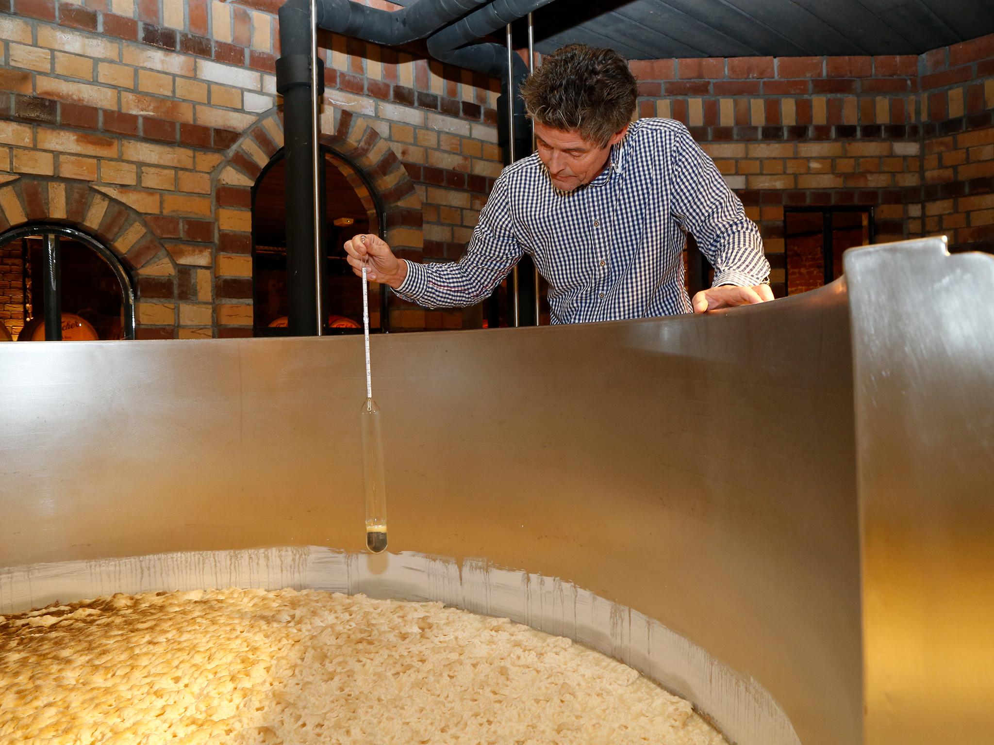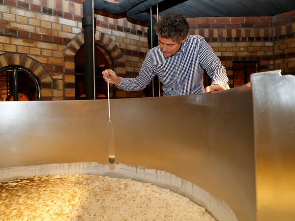 Mit dem historischen Sudhaus am Schillerplatz hat die Tucher-Rarität eine Heimat gefunden. Denn hier, im kühlen Gär- und Lagerkeller, reift es in Ruhe heran. Über eine Wendeltreppe geht es hinab in die Herzkammer des denkmalgeschützten Ziegelbaus, vorbei an der mit romanischen Fenstern ausgebildeten Gärkapelle. Gut vier Dutzend alte Eichenholzfässer türmen sich an der Kellerwand auf, jedes von ihnen mit einem Fassungsvermögen von 220 Litern. „Befüllt in der Starkbierausprägung, wegen der langen Lagerzeit“, wie Braumeister Rudolf Distler betont. Auf Bestellung wird das Original Tucher Nürnberger Rotbier per Hand über eine kleine Fassanlage als Vollbier abgefüllt, veredelt mit einem kräftigen Schuss Starkbier aus dem Holzfass.