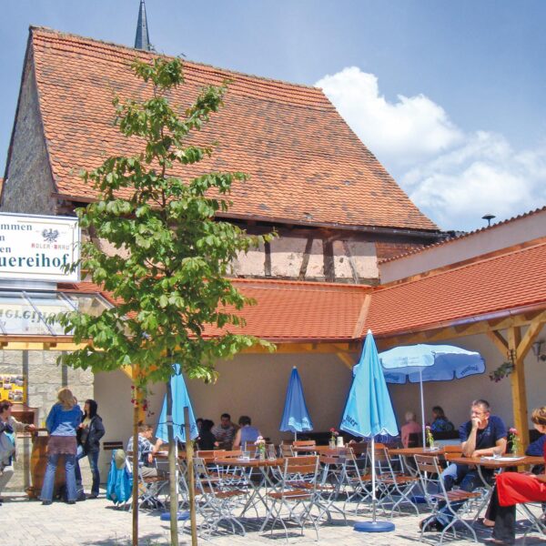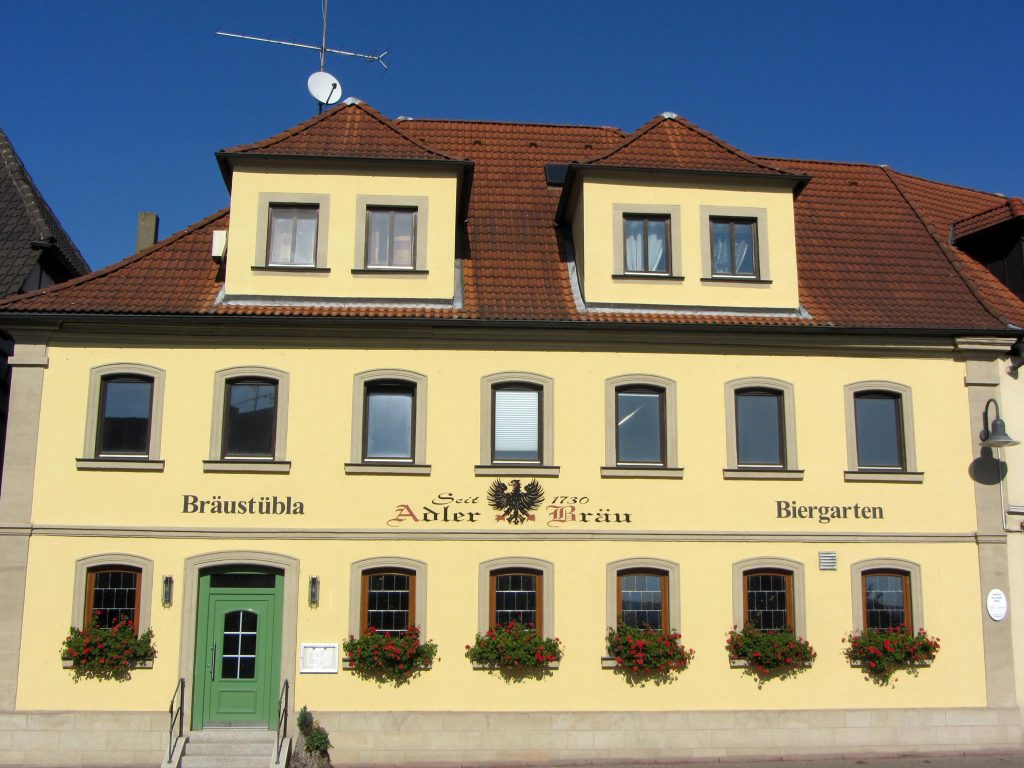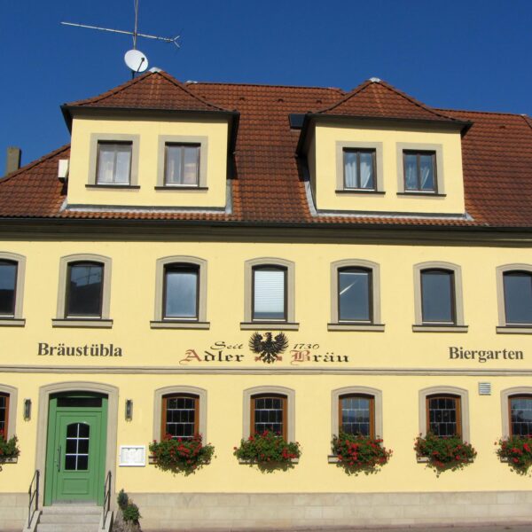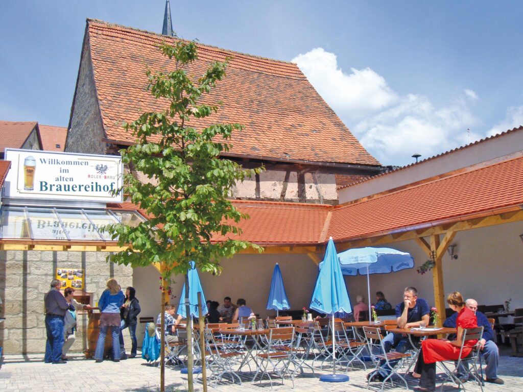 Bis vor eingen Jahren wehte hier noch der Sudkesseldampf um die Nasen der Besucher, heute sitzen unter der rustikalen Balkendecke die Gäste der Brauereigaststätte. Der Hausmetzger liefert Spezialitäten aus eigener Schlachtung, die im Sommer besonders im kleinen Brauereihof bestens munden. Auf den Außenplätzen hat man zudem den Kirchturm immer schön im Blick, der dafür verantwortlich ist, dass einmal im Jahr zur Kirchweih richtig was los ist. Dann werden hier im Bräustübla mit Bocksbraten, Ente und Gans echte Schmankerl serviert.