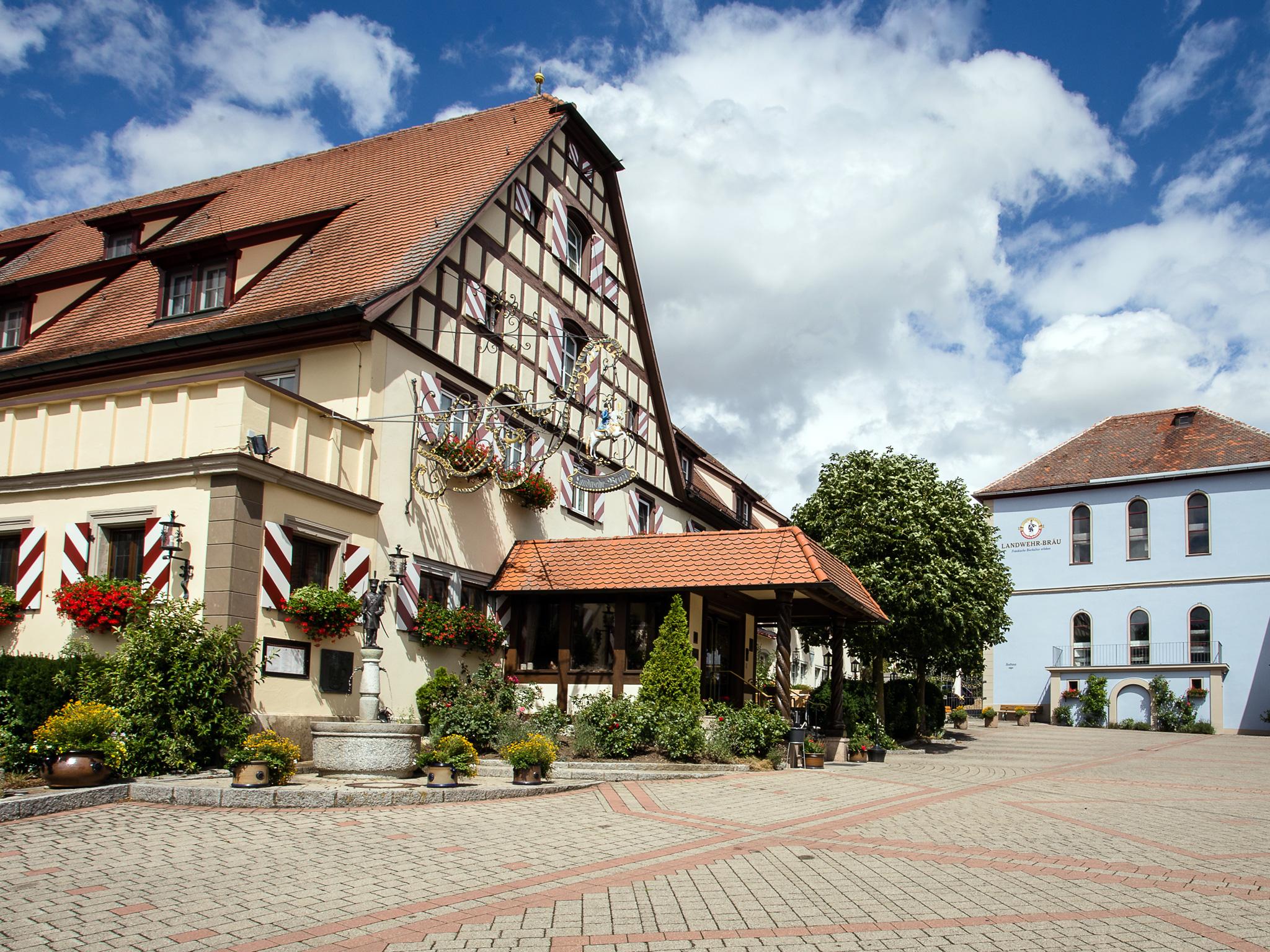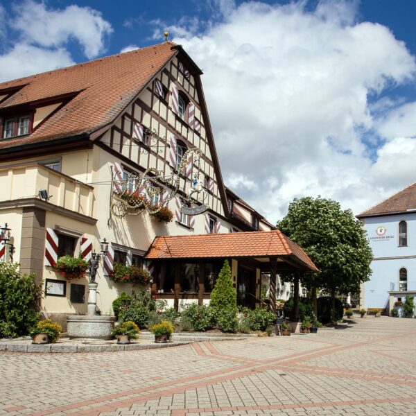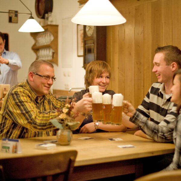 Ob altes Lokal, Fichte-, Kamin- oder Biedermeierzimmer und weitere Gasträume, überall können Sie das gute Landwehr-Bier verkosten, besonders schön natürlich auf der Sonnenterrasse, die sich weitum das Anwesen zieht. Von hier hat man auch einen wunderbaren Blick auf die Brauerei und das dortige Geschehen. Das landet dann auch direkt im Krug, wie etwa das Bauernseidla oder das Kellerbier. Die Auswahl an Bieren ist fast so reichlich wie die der Speisekarte. Bei manchen Gerichten spielt sogar der Gerstensaft als Zutat eine Rolle, wie beispielsweise beim Bierkutscherteller mit Medaillons von Rind und Schwein auf Dunkelbiersoße.