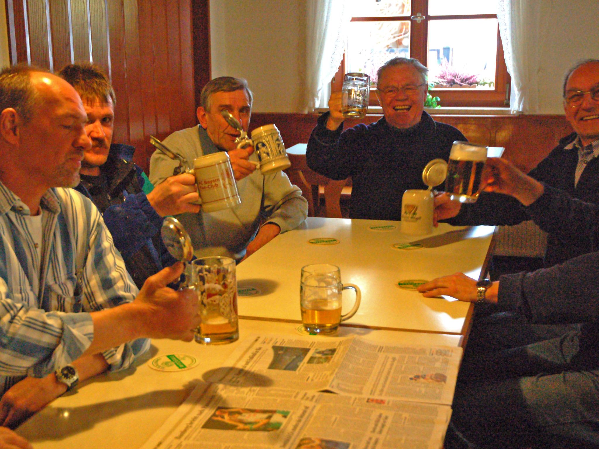 Hinter dem Zapfhahn am frisch angestochenen Fass steht Erich Witzgall und füllt die Krüge der Durstigen bis zum Rand. Die bringen ihre Deckel zum Striche-Machen selber mit.