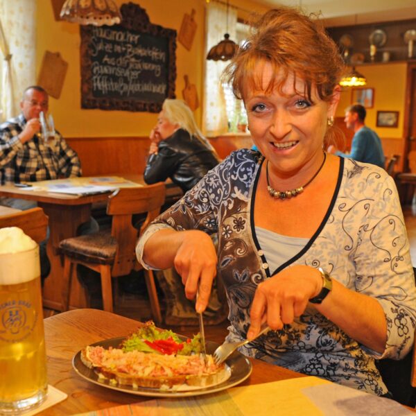 Ausschließlich frisch vom Fass kommt das Kräußen, ein unfiltriertes, naturbelassenes Pils, für das Brauer und Wirt Johannes Hacker steht. Er braut natürlich auch andere Köstlichkeiten – allen voran seinen süffigen Bock – die bestens zu den deftigen Spezialitäten des Hauses munden. Pflichttermin ist hier ein Besuch im Zeitraum zwischen Martini und Weihnachten, wenn Gänsebrust oder auch ganze Gänse – nach dem alten Familienrezept zubereitet – serviert werden. Doch logischerweise macht der Ausflug auch im Sommer Spaß, vor allem, weil die Gäste dann vor den verglasten Sudkesseln sitzen und sich das Ergebnis der Arbeit von Johnny Hacker schmecken lassen können.