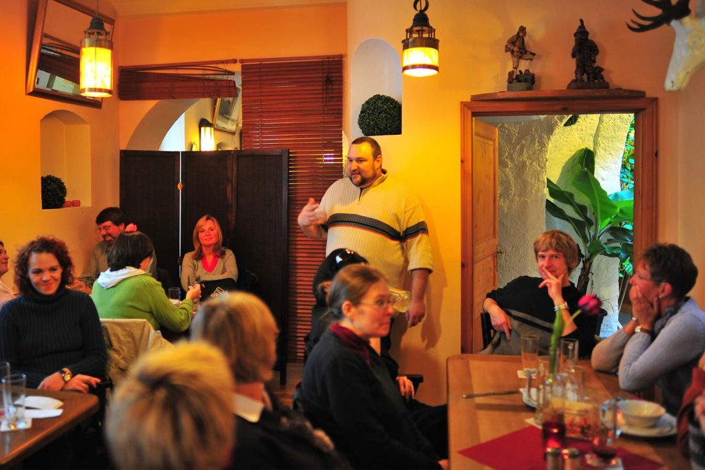 Fränkische Brotzeiten. Täglich große Karte mit warmen Gerichten. Spezialitäten: Ribeye-Steak vom heißen Stein, Schäuferla, Braumeister-Schnitzel, Flammkuchen.