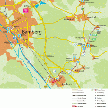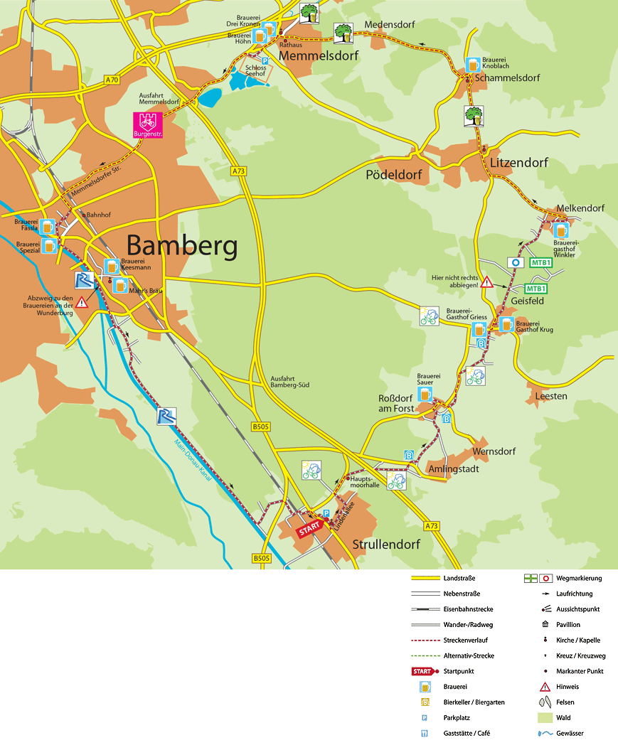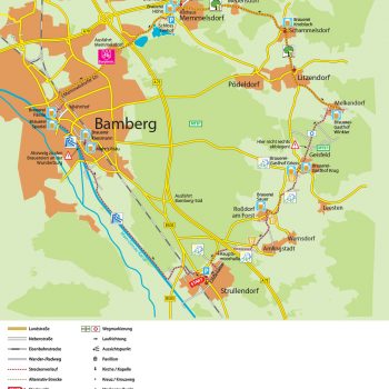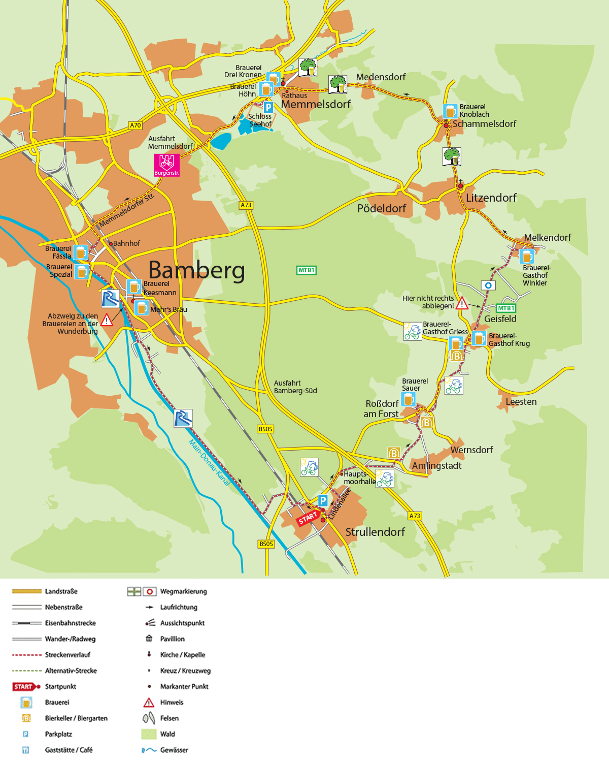 Kurz vor der Bahnunterführung lohnt ein Abstecher nach links zur Röstmalzbierbrauerei Weyermann in der Brennerstraße. Am Bahnhof Bamberg besteht die Möglichkeit, die Tour zu verkürzen und mit dem Zug nach Strullendorf zu fahren. Sonst biegen Sie kurz vor dem Bahnhof in die Klosterstraße und gelangen dann im Zick-Zack durch kleine Straßen zur „Unteren Königstraße“, wo Sie die Brauereien Fässla und Spezial vorfinden. Vorbei an der Volkshochschule geht es nun zum Main-Donau-Kanal. Auf der Uferpromenade folgen Sie nun der Ausschilderung „Regnitz-Radweg (Kanalroute)“. Wer möchte, kann an der Straße „Wunderburg“ noch einen Abstecher zu zwei weiteren Brauereien machen. Am Kanal entlang geht es nun der Markierung folgend zurück nach Strullendorf.