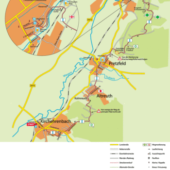 Durch das Wohngebiet von Altreuth geht es dann hinunter nach Pretzfeld. In der Ortsmitte bietet sich die Brauerei Nikl für eine erste Pause an. Von der Brauerei aus geht es durch die Straße „Im Steinbühl“ den Berg hinauf Richtung Pretzfelder Keller. An den Kellern vorbei führt der Weg steil bergauf Richtung Jüdischer Friedhof (der Friedhof ist abgeschlossen, man kann aber einen Blick durch das Tor werfen). Dort zweigt die Markierung links Richtung Schlüsselstein ab.