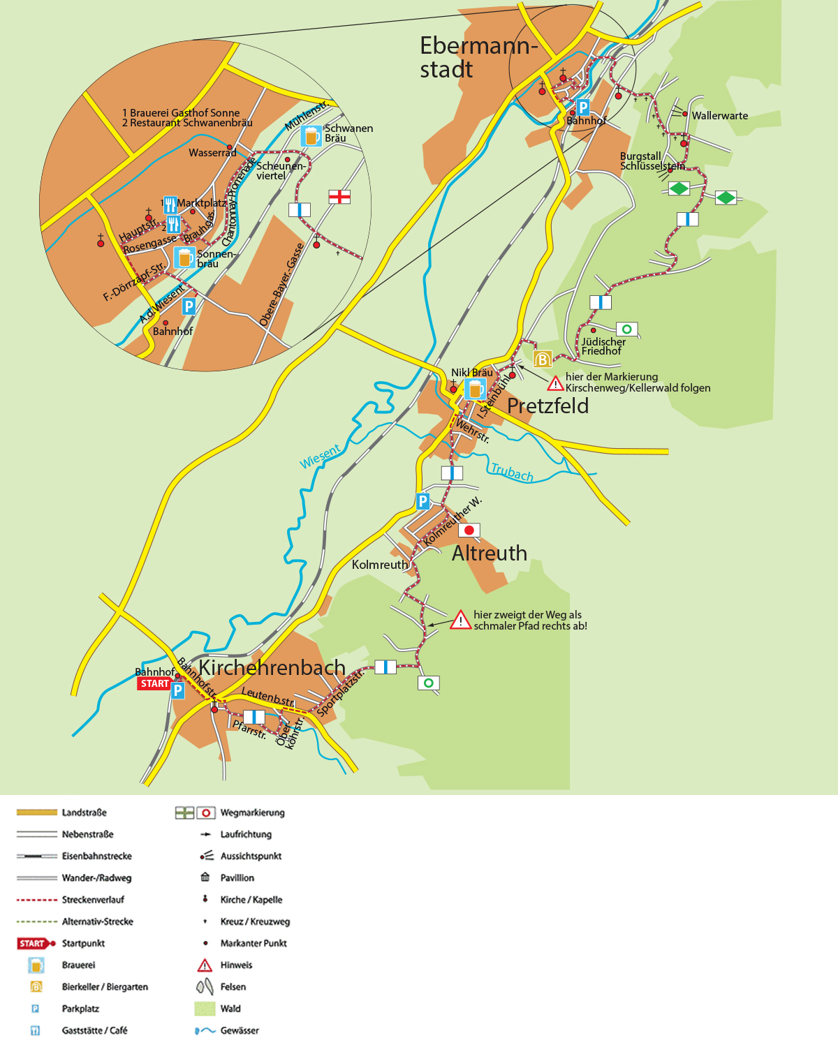 Nach ca. 200 Metern führt ein Durchgang rechts in der Mauer in die Brauhausgasse, in der Sie die letzte Brauerei dieser Tour finden. In der Hauptstraße liegt die Brauereigaststätte der Schwanen Bräu. Nun geht es zurück zum Bahnhof, von wo Sie mit der Bahn zurück nach Kirchehrenbach kommen (bitte Fahrplan beachten).