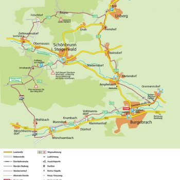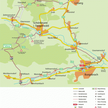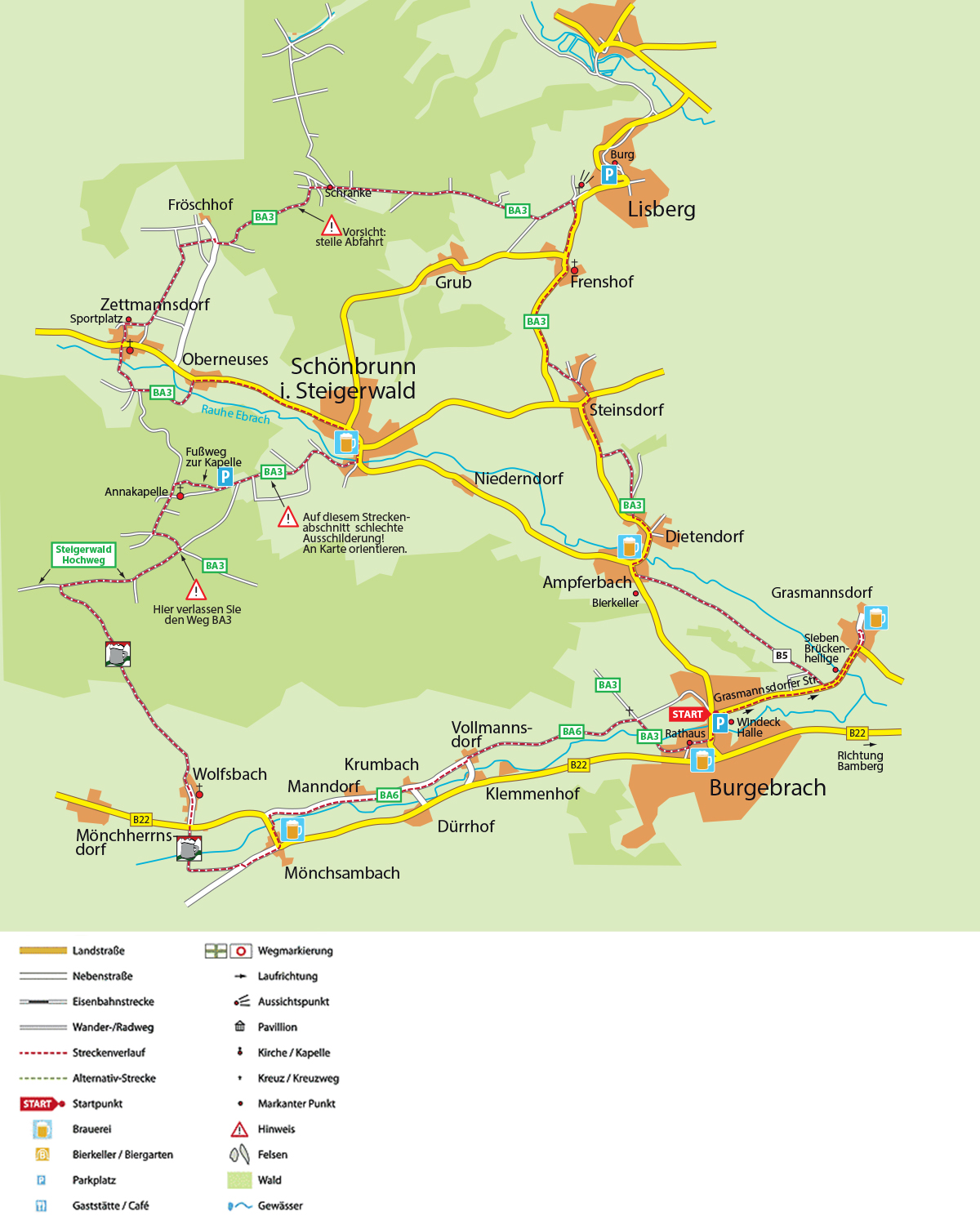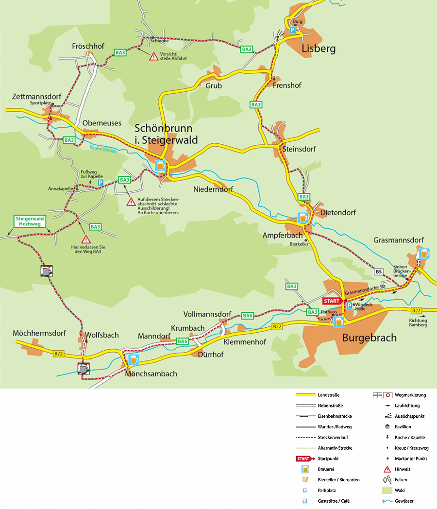 Jetzt müssen Sie umdrehen und ein kurzes Stück der Strecke zurückradeln, bis hinter der Brücke rechts ein Feldweg mit der Markierung B5 abzweigt. Auf diesem Weg geht es immer geradeaus bis Ampferbach (Brauerei Nr. 2). Ab hier folgen Sie dem gut ausgeschilderten Radweg BA3. Über Dietendorf, Steinsdorf und Frenshof führt dieser Weg bis Lisberg. Hier bietet sich ein Abstecher zu Burg Lisberg an, die nach Voranmeldung besichtigt werden kann. Der Radweg BA3 zweigt allerdings kurz vor dem Ort links ab und durch den Wald nach Zettmannsdorf und weiter nach Schönbrunn.