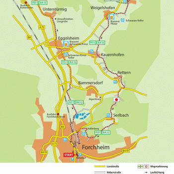 Startpunkt der Radtour ist der Bahnhof in Forchheim. Folgen Sie nach rechts der Ausschilderung FO1 / BA12, die Sie auf der ganzen Runde begleiten wird.