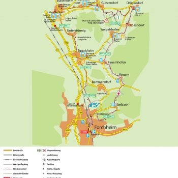 Über Weigelshofen und Kauernhofen geht es nun nach Rettern. In Sichtweite der Jägersburg zweigt der Weg links ab nach Serlbach (Markierung „roter Punkt“) und dann über den Forchheimer Kellerwald mit seinen unzähligen Bierkellern zurück zum Bahnhof. Wer dann noch Lust auf mehr hat, findet in der Forchheimer Innenstadt drei weitere Brauereien (Greif, Hebendanz und Neder).