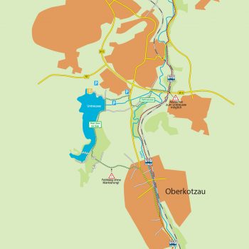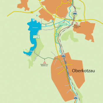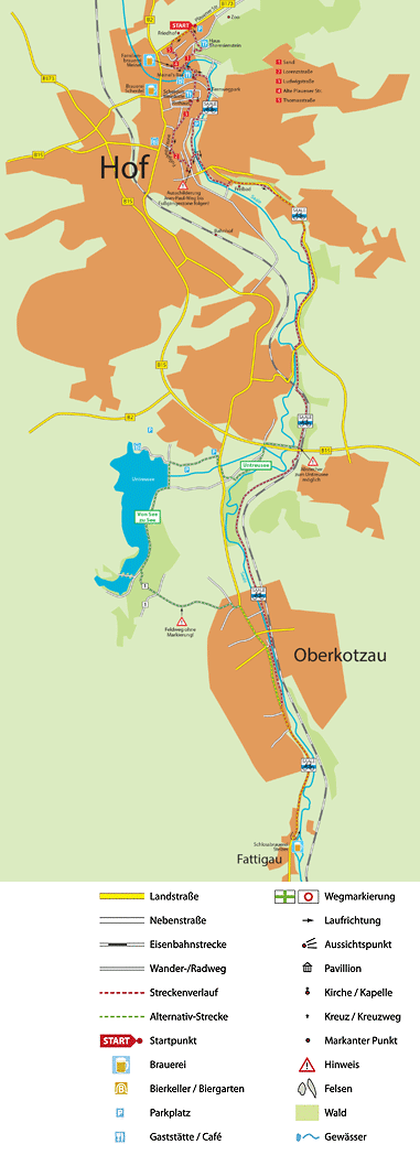 Über die Straße „Sand“ gelangen Sie zur „Vorstadt“, wo Sie rechts die Gastwirtschaft der Familienbrauerei Meinel finden. Kurz dahinter biegen Sie links in den Saale-Radweg – gegenüber der Kirche – ein. Dieser Weg begleitet Sie entlang des Flusses aus Hof hinaus. Wo der Radweg die Bundesstraße 15 unterquert, gibt es die Möglichkeit eine Alternativtroute (grüne gestrichelte Linie) zum Untreusee zu wählen. Folgen Sie dazu der Ausschilderung „Untreusee“ bzw. „Von See zu See“. Egal ob Sie an der Saale bleiben oder zum Untreusee fahren – beide Routen bringen Sie nach Oberkotzau und dann nach Fattigau, wo sich die Schlossbrauerei Stelzer für eine Pause anbietet.