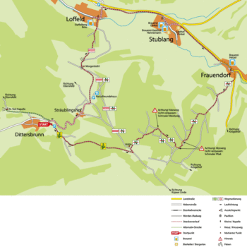 Bitte beachten Sie die Hinweise in der Karte und laufen Sie diese Strecke mit großer Aufmerksamkeit. Der Weg führt schließlich an einer Schutzhütte wieder aus dem Wald. Hier verlassen Sie die Markierung „N“ und gehen nach links, um kurz danach rechts Richtung Dittersbrunn abzubiegen. Immer geradeaus geht es, der Markierung „Kehlbachtaler Höhenweg“ folgend, zurück zum Parkplatz.