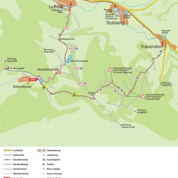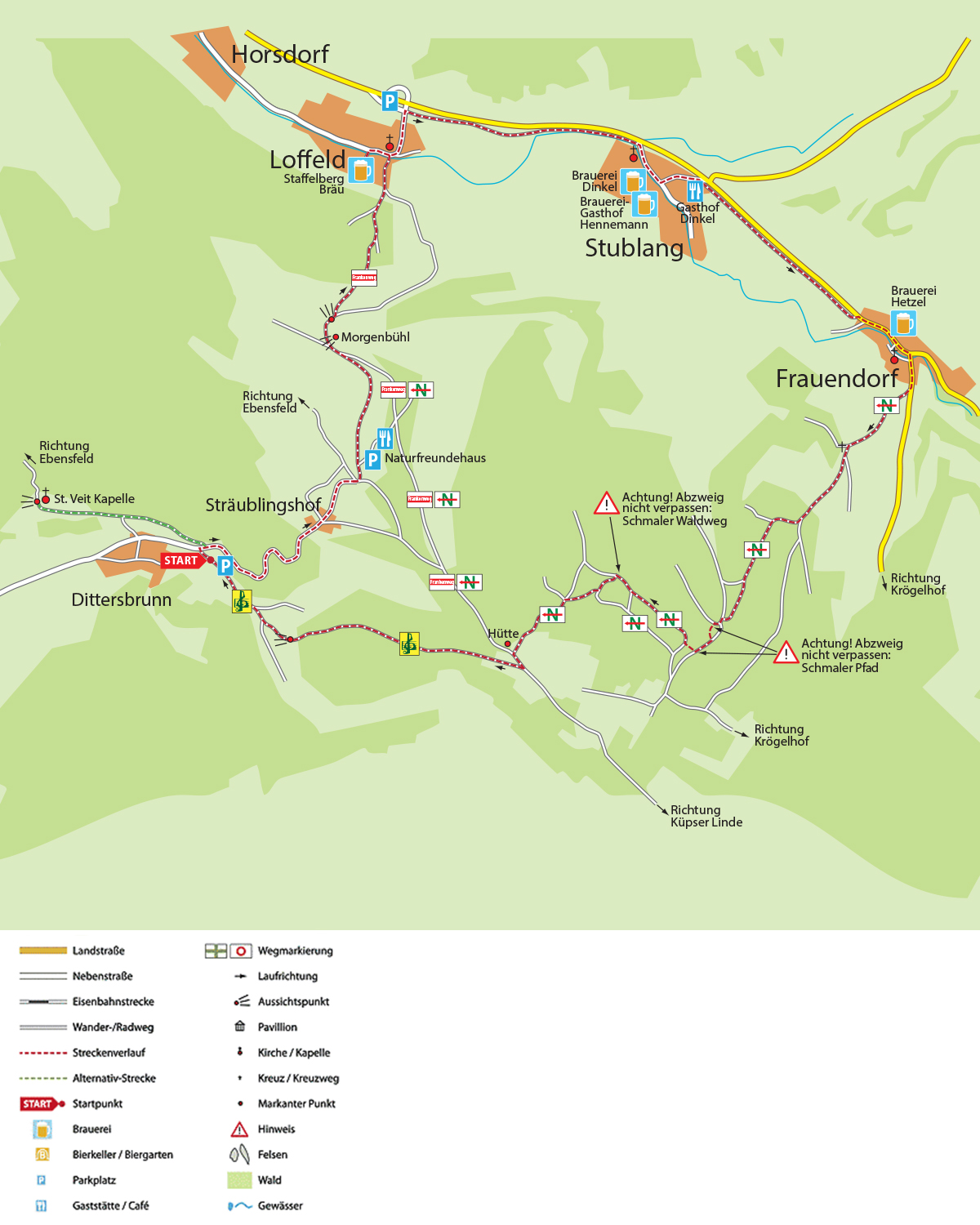 Die Brauerei im Ort liegt etwas rechts ab vom Weg. Über den Radweg am Ortsausgang von Loffeld gelangen Sie rechts nach Stublang mit zwei weiteren Brauereien und dann weiter nach Frauendorf mit der letzten Brauerei. Nach der Kirche biegen Sie rechts ab Richtung Krögelhof. Kurz darauf zweigt ebenfalls rechts ein Weg mit der Markierung „N“ ab. Dieser Markierung folgen Sie steil den Berg hinauf. Oben angekommen, gibt es mehrere „Möglichkeiten“ sich zu verlaufen.