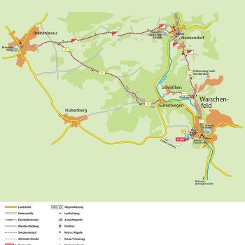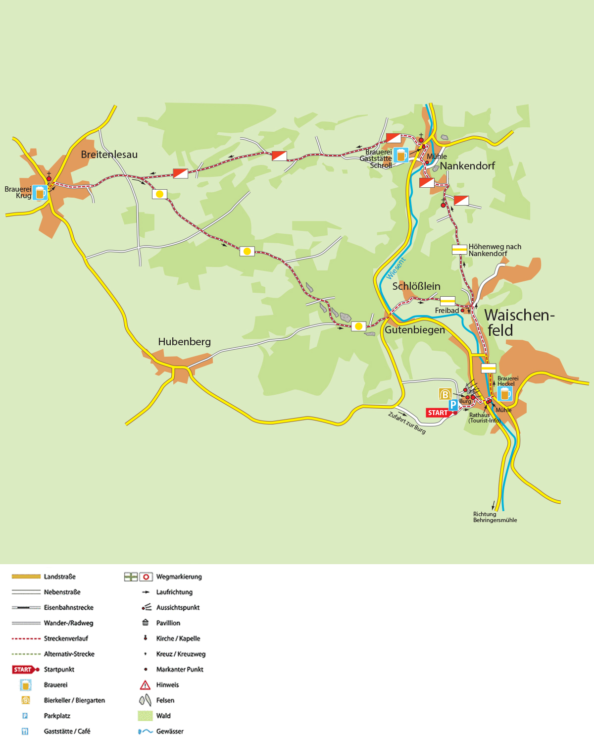 Teilweise ist dieser Weg mit der Bezeichnung „Brauereienweg“ und dem Waischenfelder Wappen markiert. Von dort führt Sie die Markierung rot-weiß geteiltes Rechteck nach Breitenlesau zur Brauerei Nr. 3. Hier drehen Sie um und verlassen den Ort auf dem gleichen Weg, bis rechts die Markierung gelber Punkt abzweigt, die Sie durch den Stagersgraben zum Waischenfelder Ortsteil Gutenbiegen bringt. Dort überqueren Sie die Landstraße und laufen durch den Weiler Schlößlein nach Waischenfeld. Über den bekannten Weg geht es zurück zur Burg.