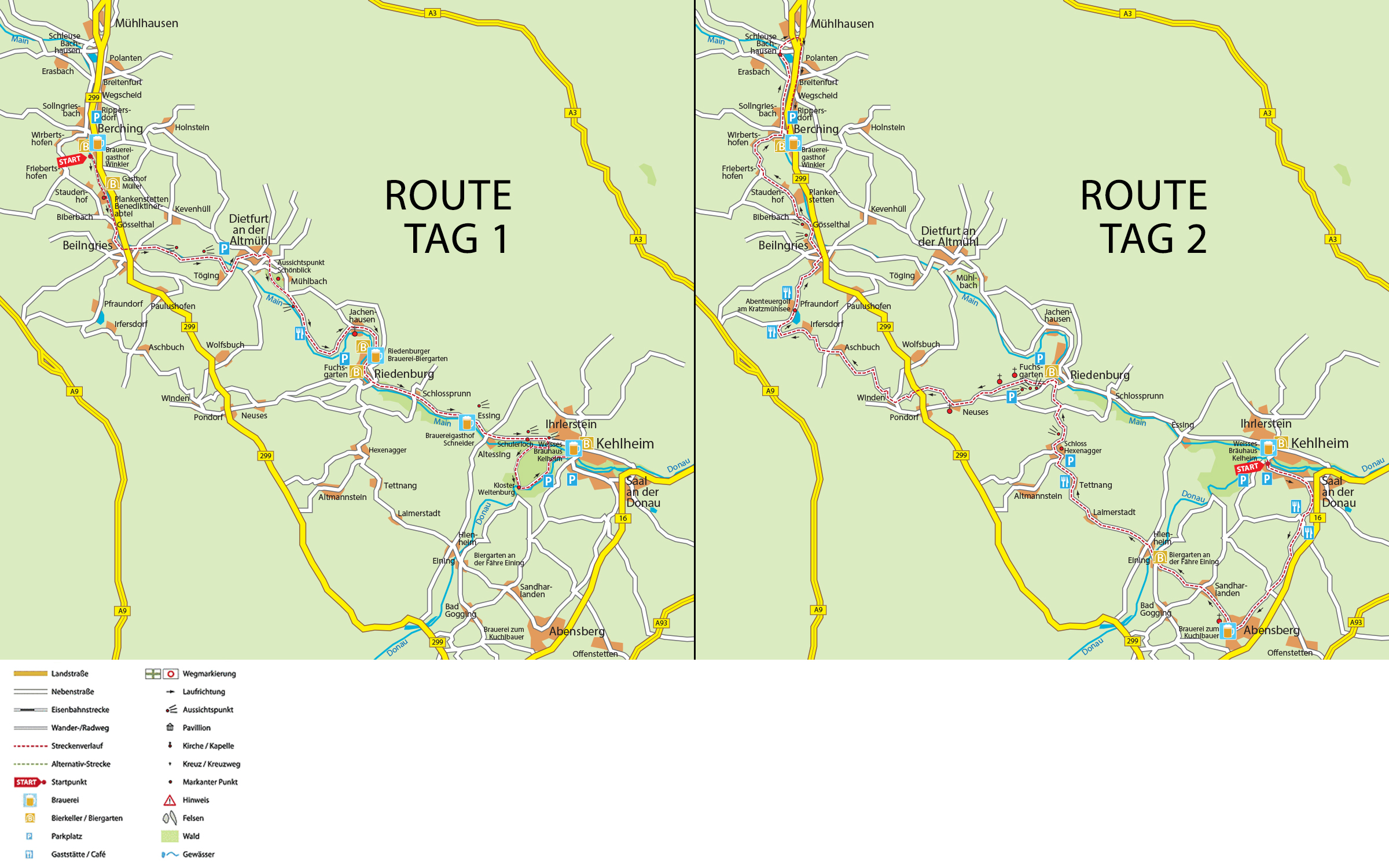 Orte entlang der Tour – Tag 1: Berching, Gösselthal, Beilngries, Töging, Dietfurt an der Altmühl, Mühlbach, Jachenhausen, Fuchsgarten, Riedenburg, Schlossprunn, Essing, Altessing, Ihrlerstein, Kehlheim