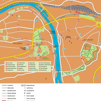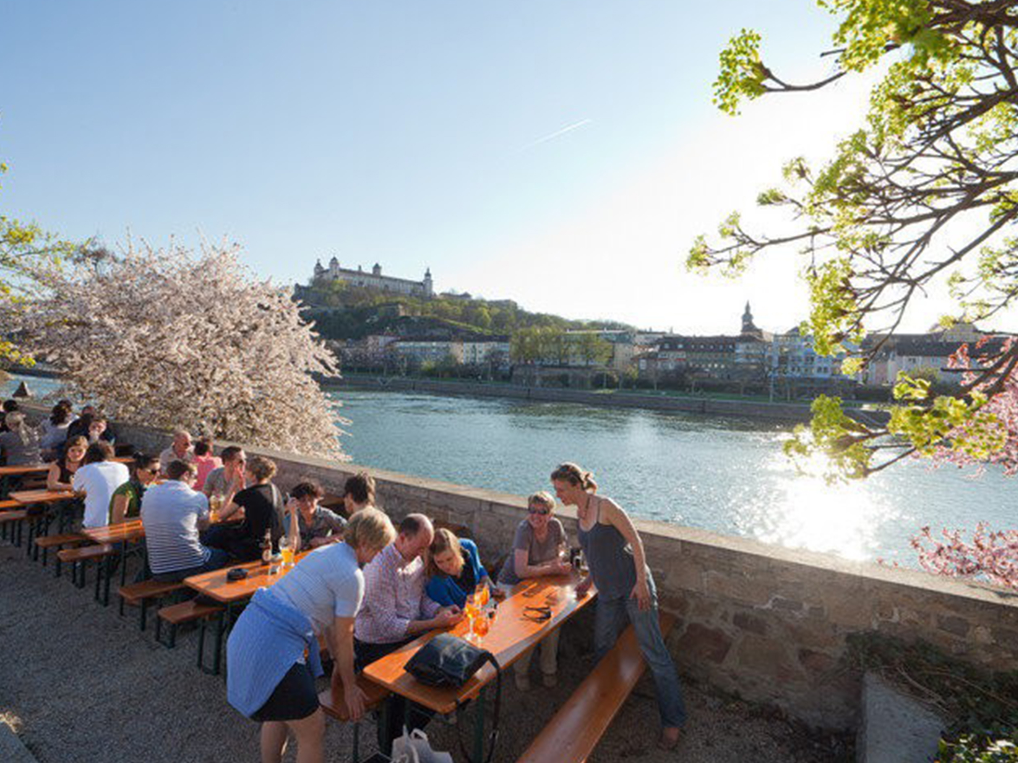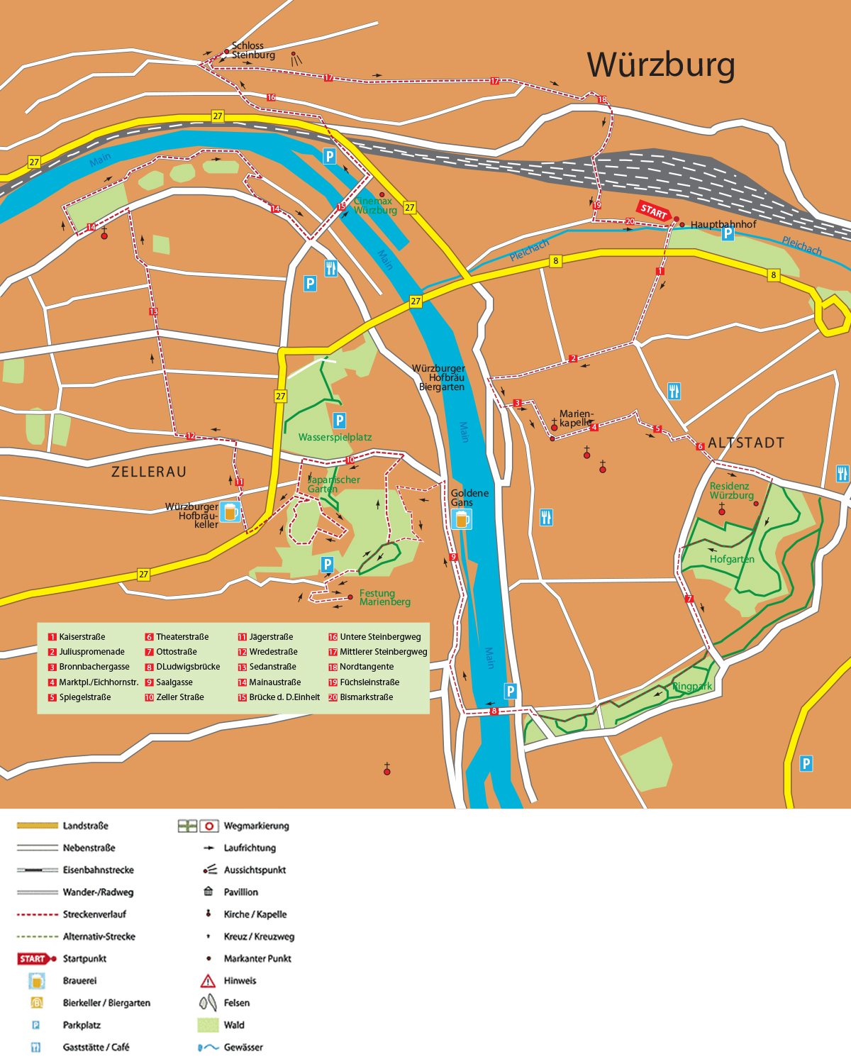 Weiter geht es dann über die Tellsteige hoch zur Festung Marienberg mit ihren Museen und natürlich dem prächtigen Ausblick. Nun führt der Weg durch die Gartenanlage zum Würzburger Hofbräukeller. Anschließend gehen Sie nach Norden, bis Sie wieder zum Main gelangen, und folgen dem Ufer nach Osten, wo die Brücke der Deutschen Einheit über den Fluss führt. Der letzte Aufstieg des Tages bringt Sie hoch zur Steinburg, wo feinstes Essen und große Weine warten. Diesem Thema bleiben Sie treu und laufen durch die Weinberge zurück zum Hauptbahnhof.